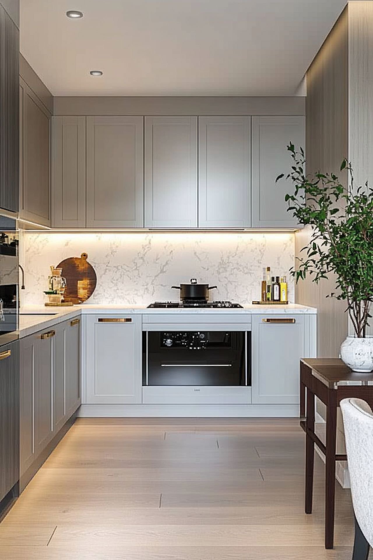 To get the most natural light, I suggest glass fronts on wall cabinets. This reflects light and adds depth. It’s vital in Kitchen Layout Ideas U-shaped to make the space feel open and flowing. A neutral color scheme also helps to make the space feel larger and more airy.