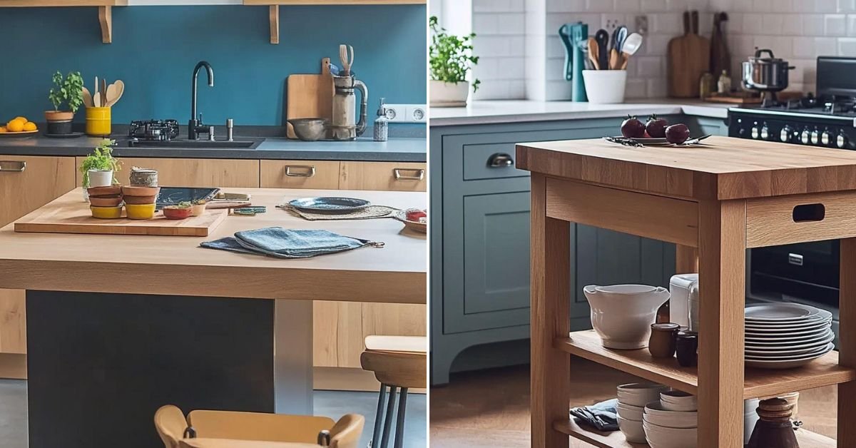 Rolling kitchen islands are super flexible and versatile. They’re perfect for small kitchens. You can move them to add space or tuck them away when not needed.