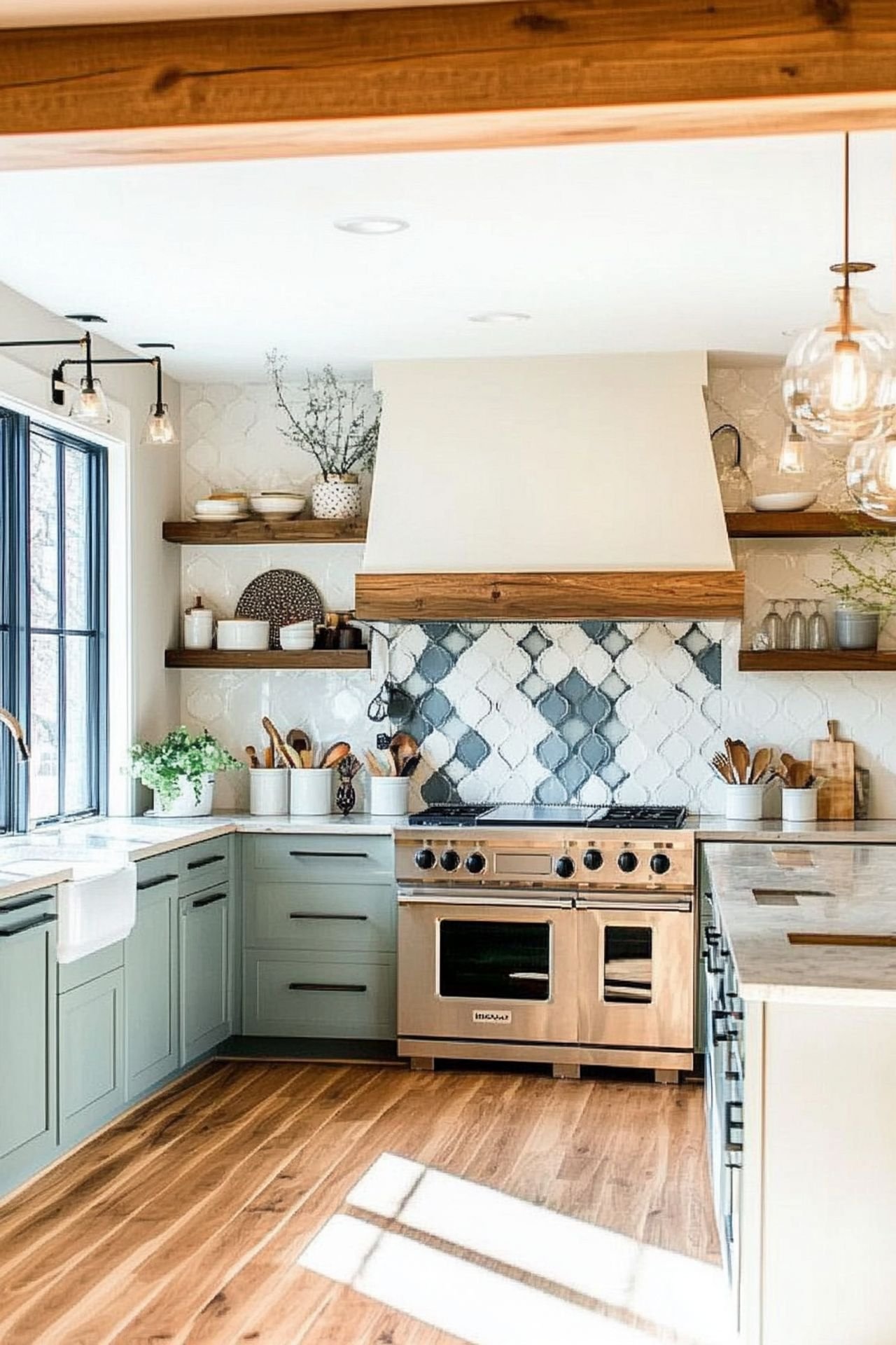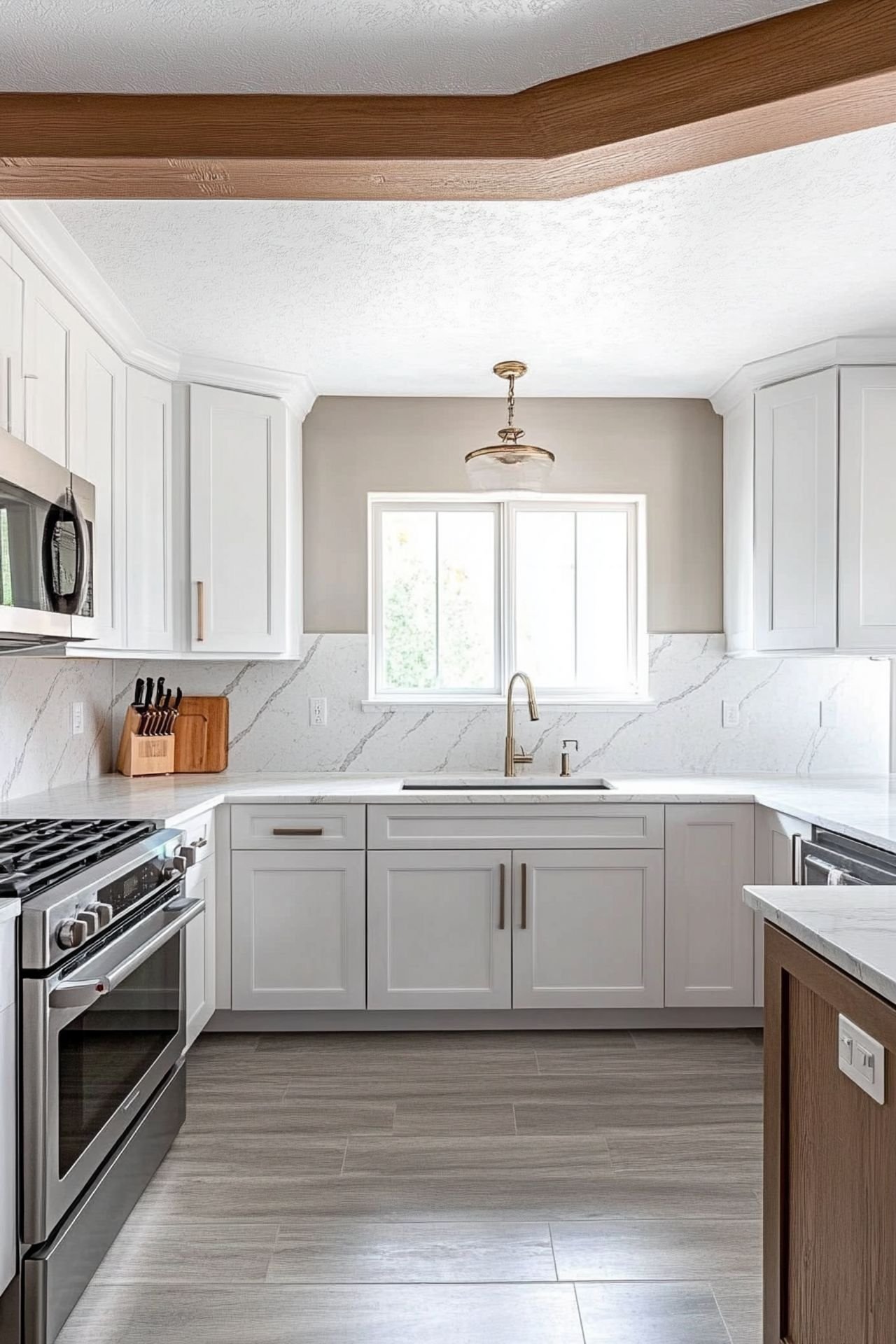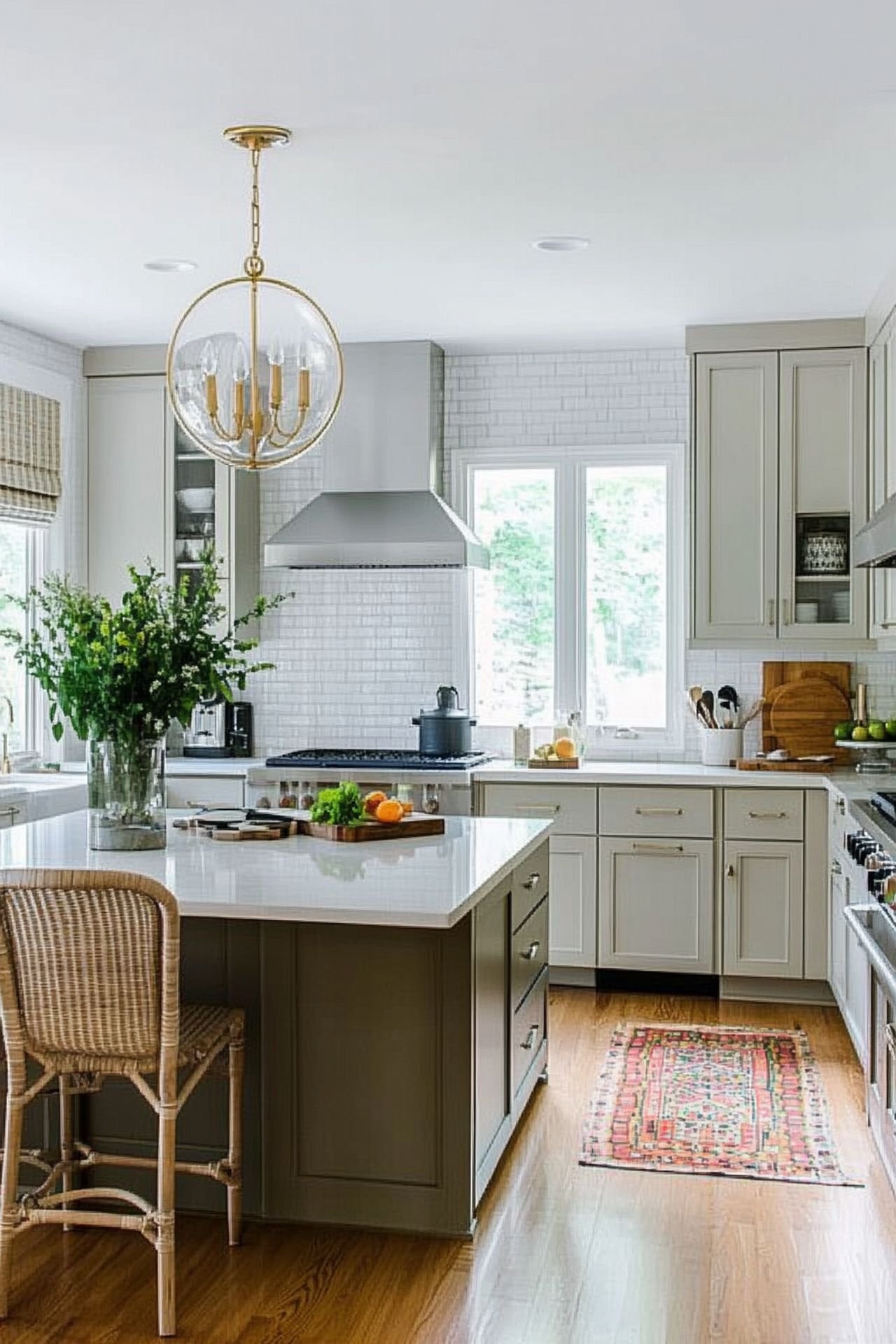 These design elements can turn your kitchen into a beautiful and useful space. Adding a pendant light can also add interest and break up the vertical space.