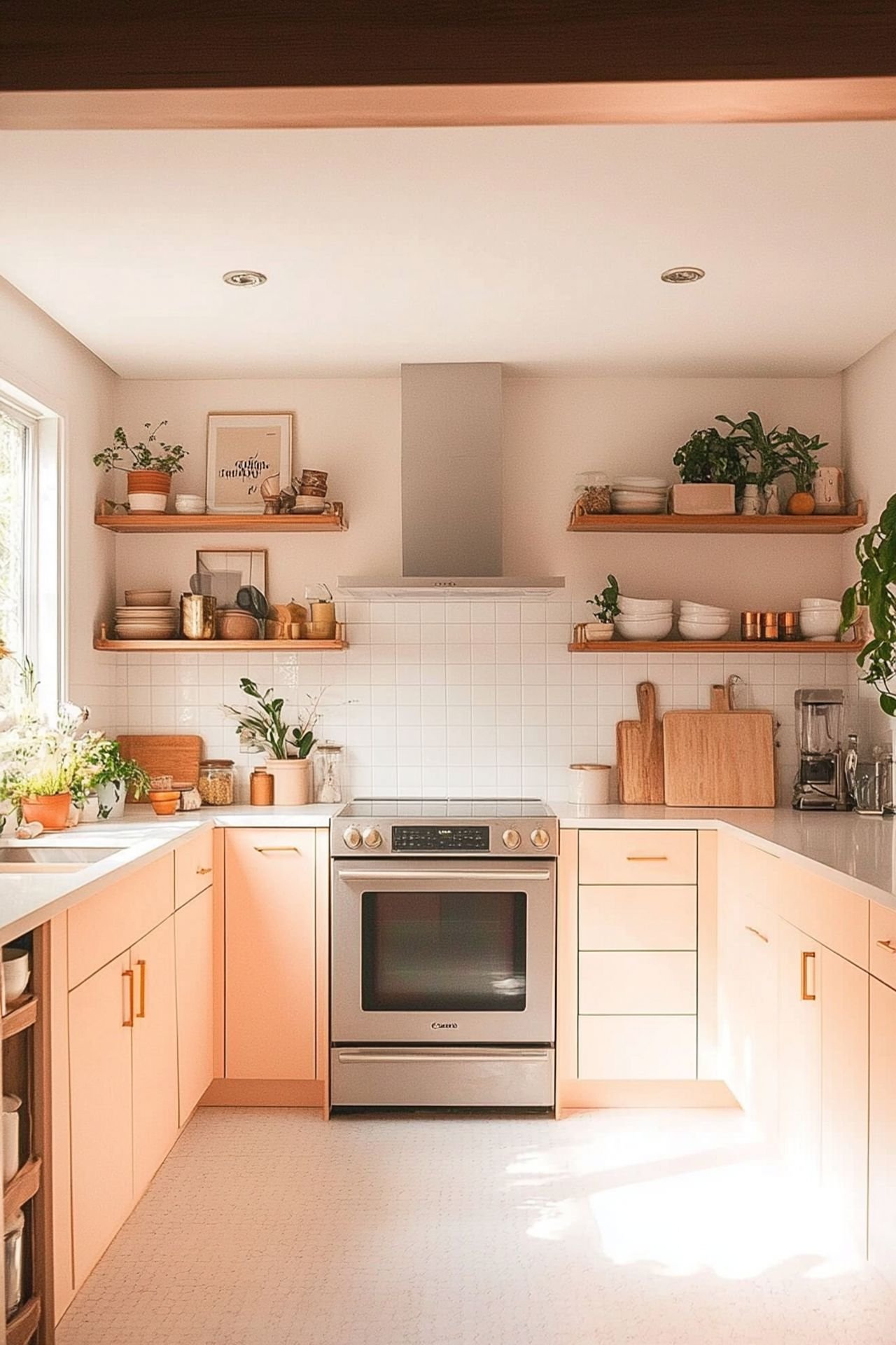 In a small U-shaped kitchen, everything is close together. It’s important to pick the right layout. Consider open shelving, glass cabinet fronts, and smart storage like pull-out racks. These ideas help make the most of your space.