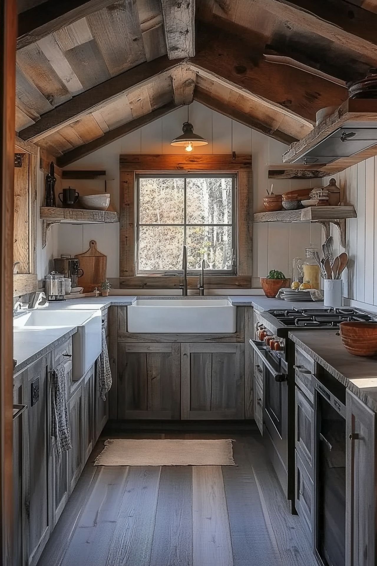 In a Tiny House Kitchen, every detail matters. Adding modern farmhouse touches, like a farmhouse sink, warms the space. Natural materials like wood and stone also make it inviting.
