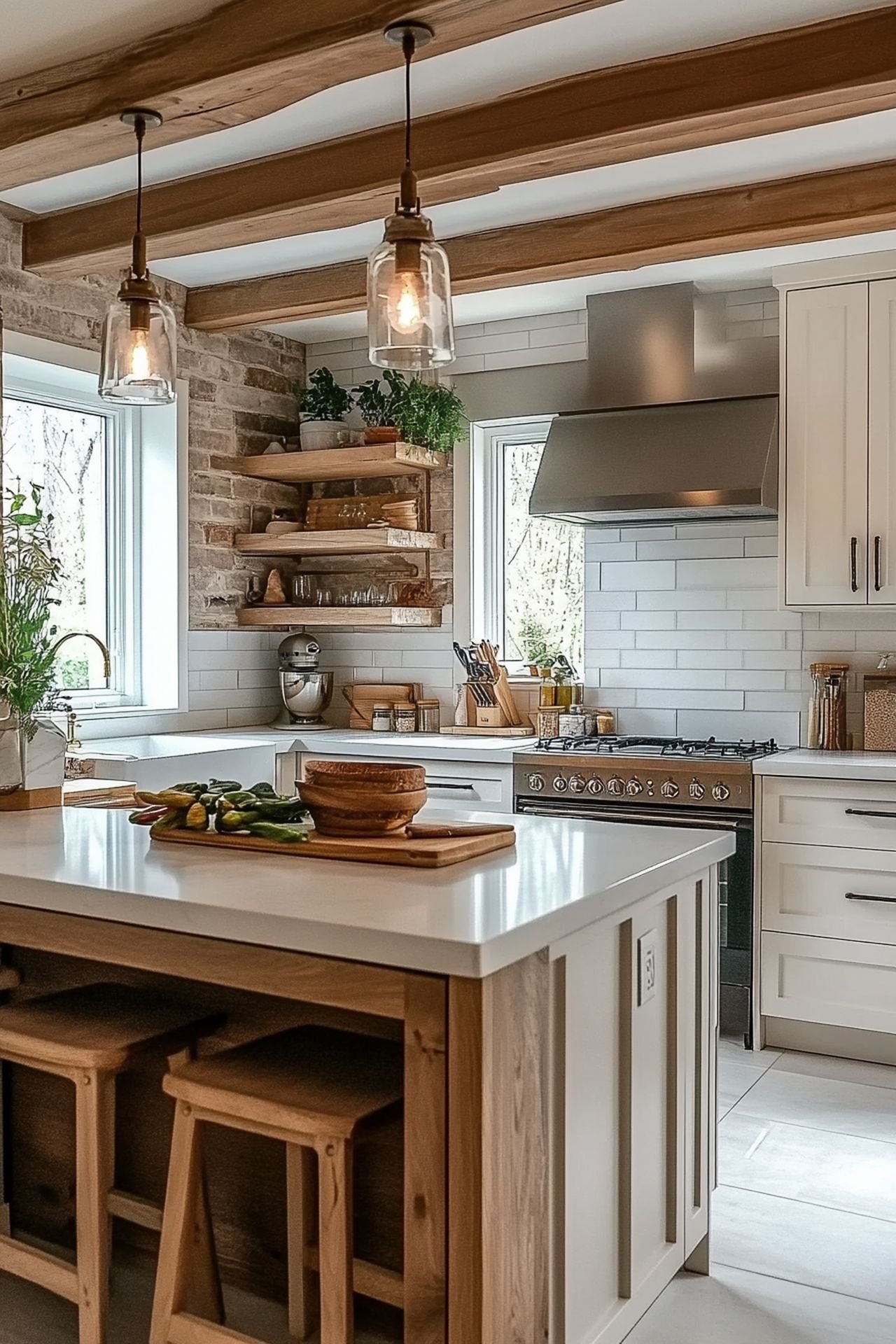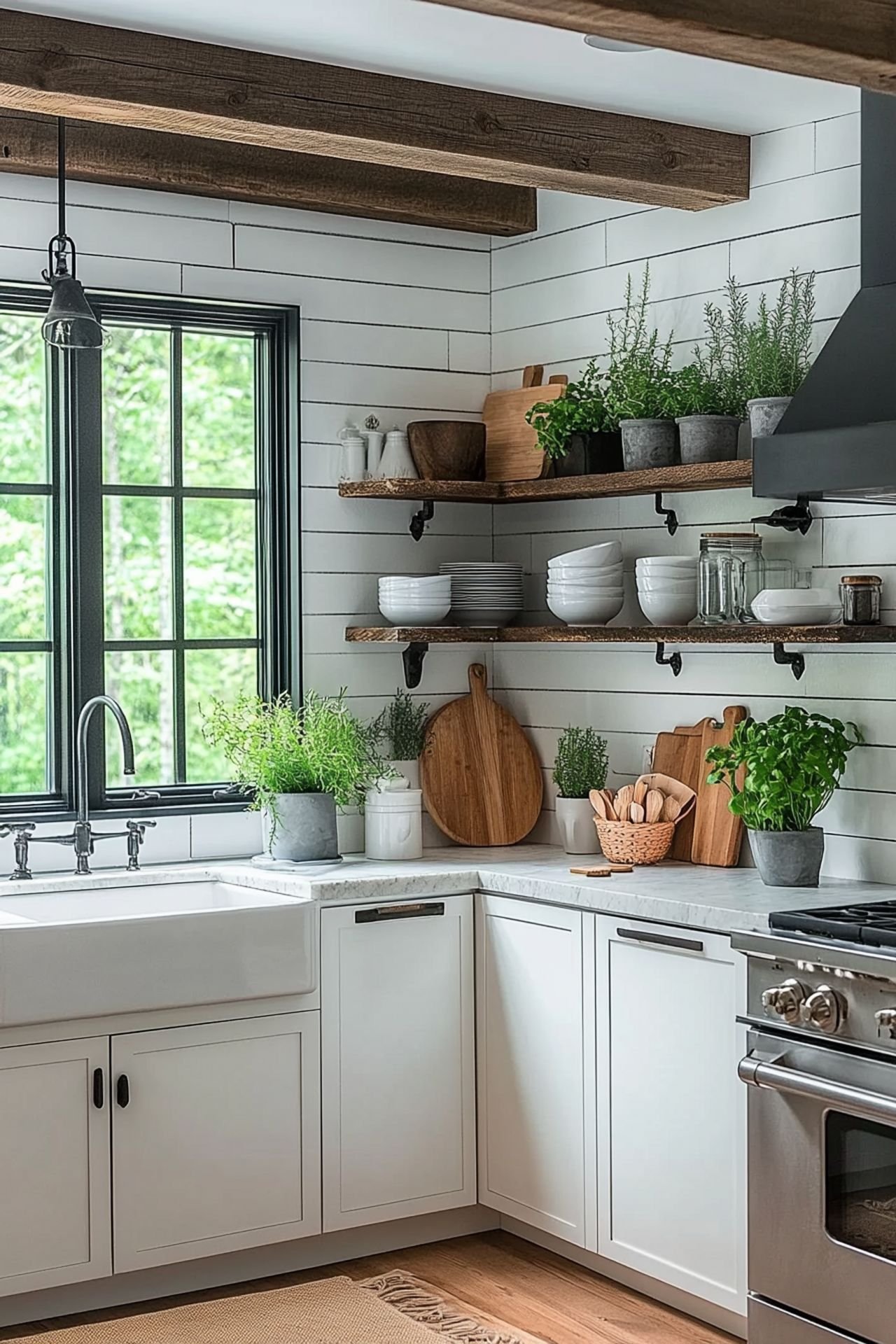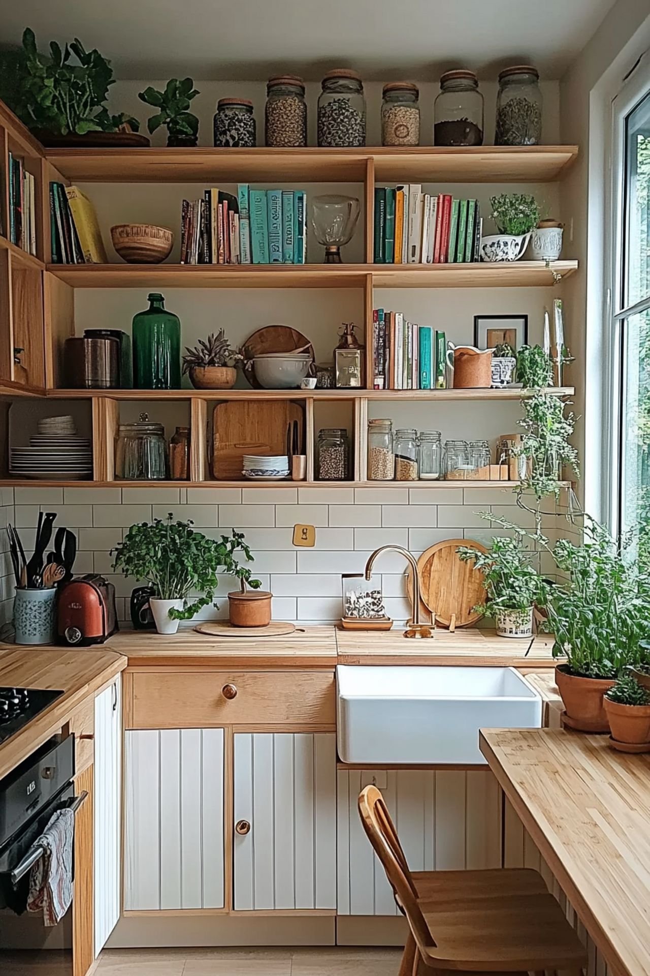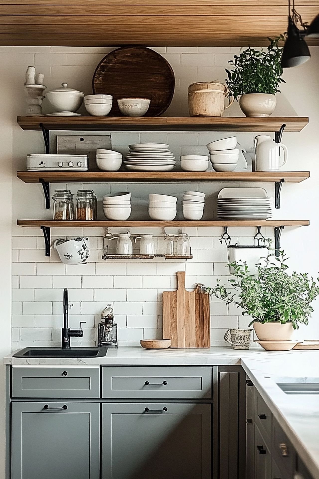 Open shelving is practical in small kitchens, making things easy to reach and saving money. Yet, it can collect dust and look cluttered. Closed storage, on the other hand, keeps things tidy but might not be as accessible or visually appealing as open shelving.