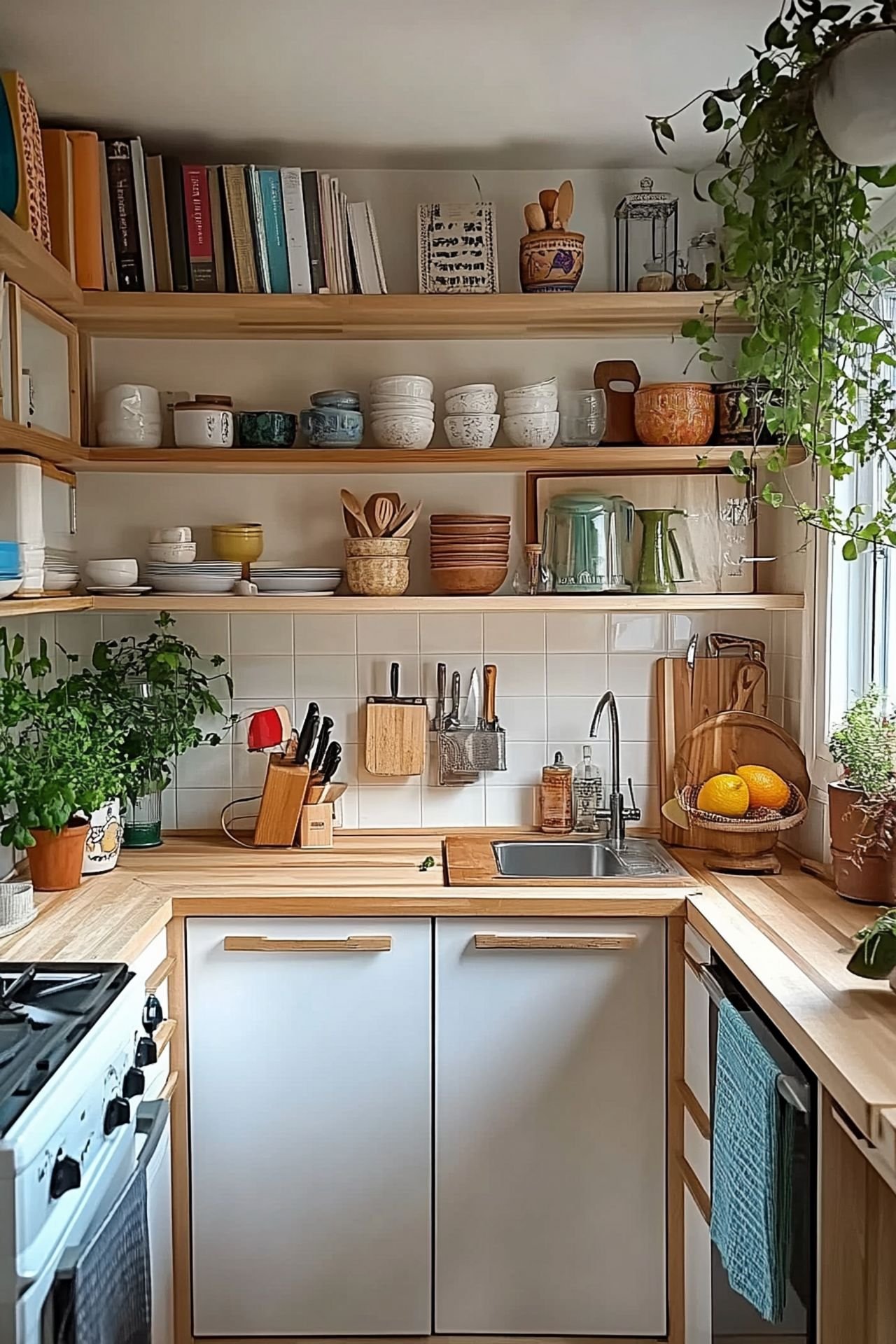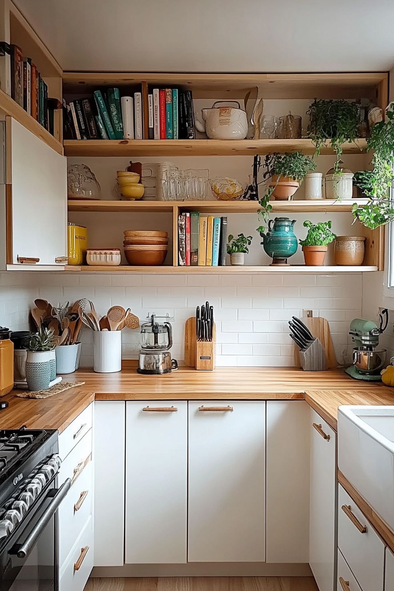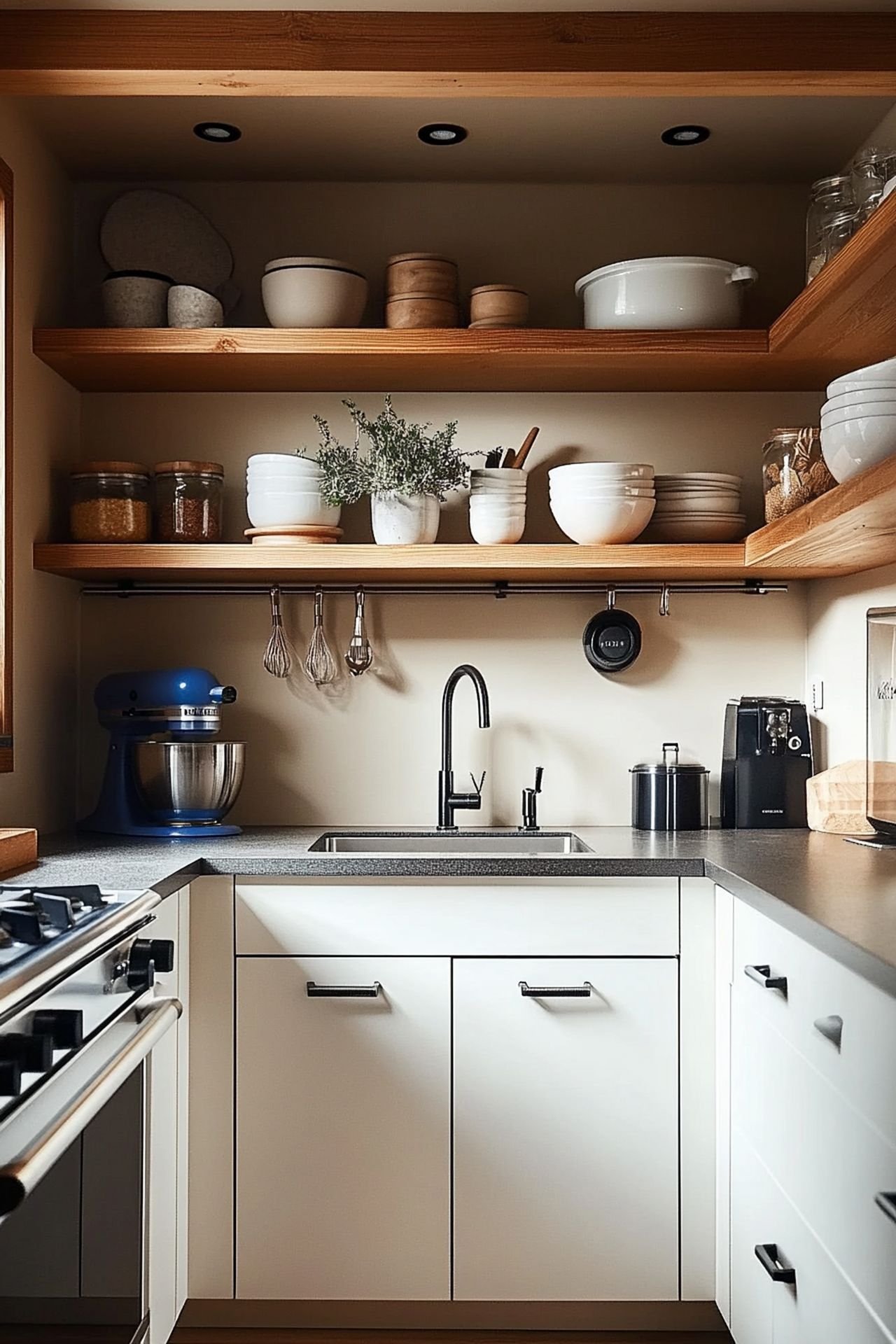 Designers often suggest mixing cabinets with open shelves for a balanced look in mini kitchens. The benefits of open shelving include: