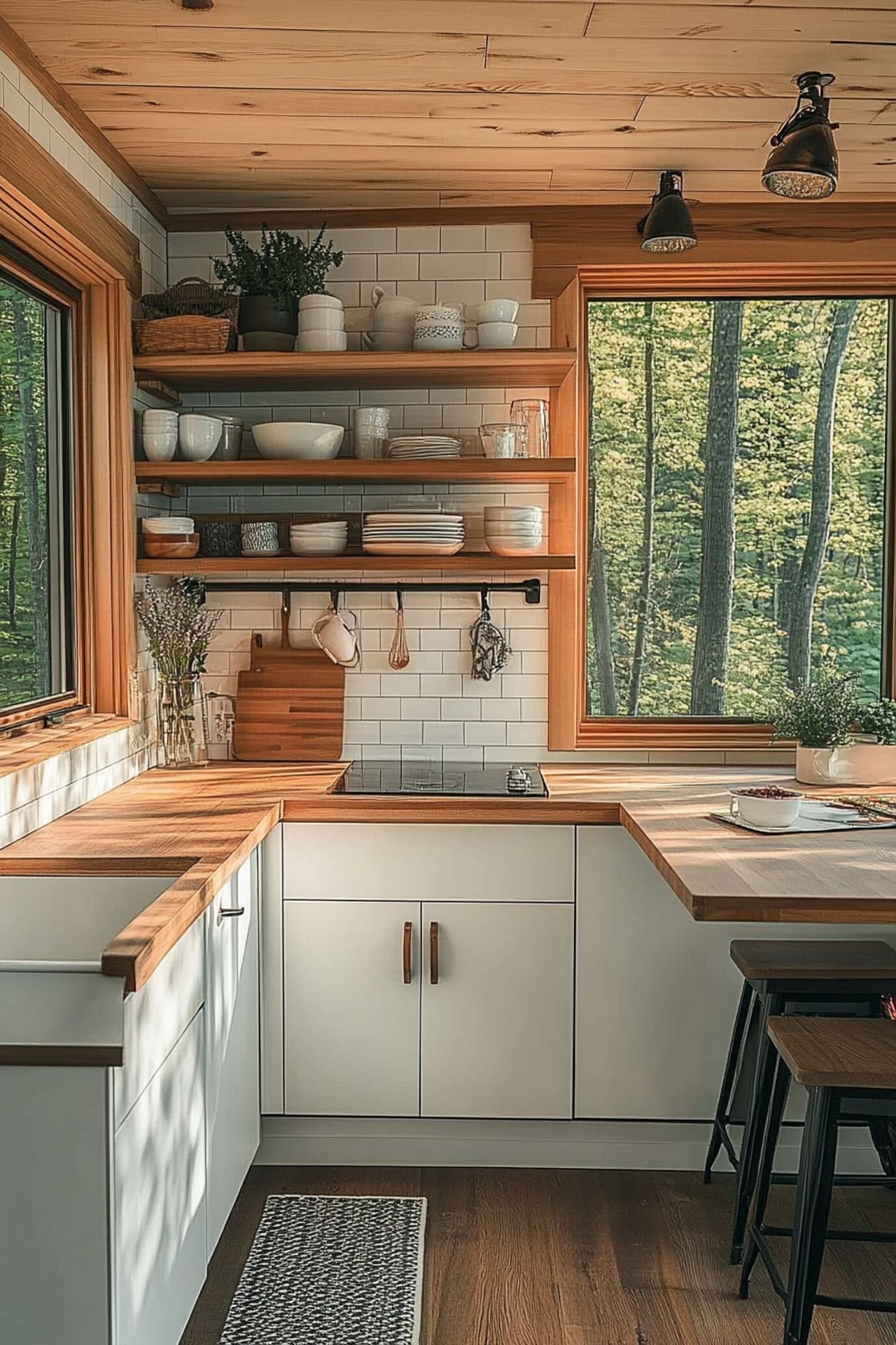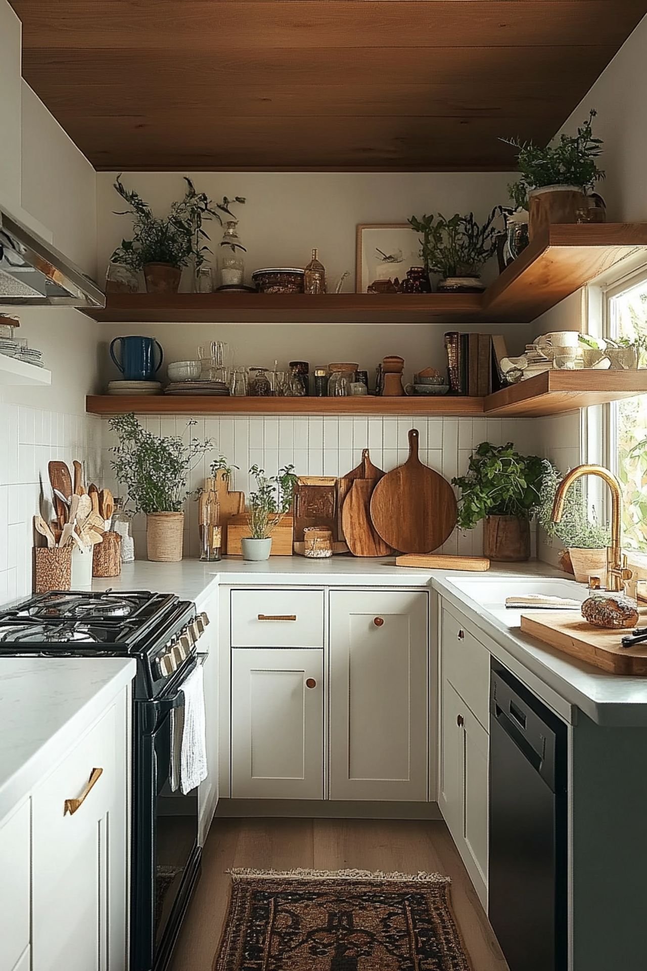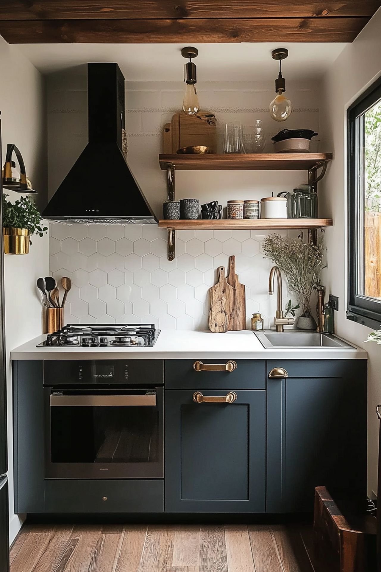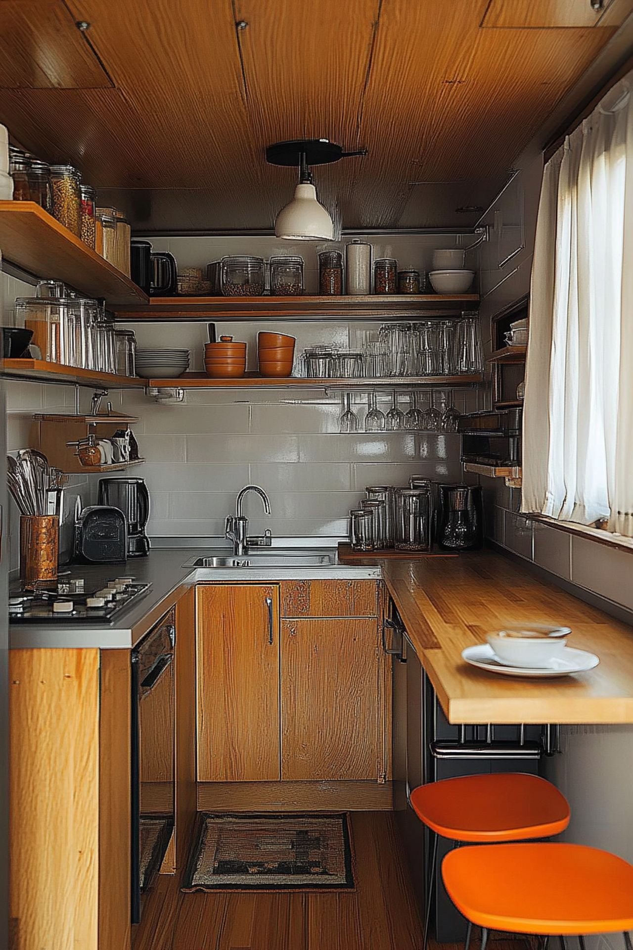 Designers often suggest mixing cabinets with open shelves for a balanced look in mini kitchens. The benefits of open shelving include: