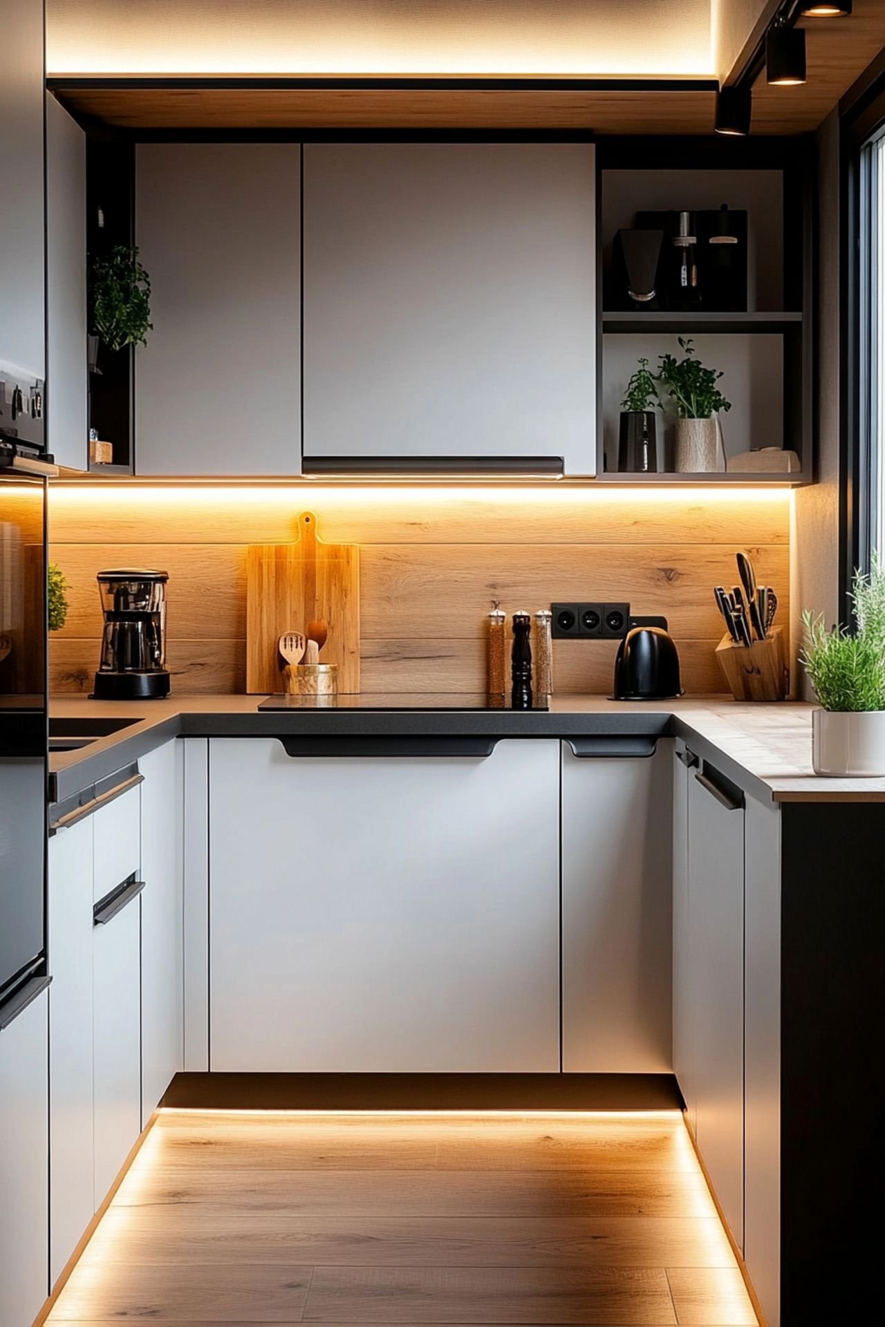 The goal is to make your mini kitchen feel open and flowing. By using LED lighting and other design tricks, you can make it feel more spacious and useful.