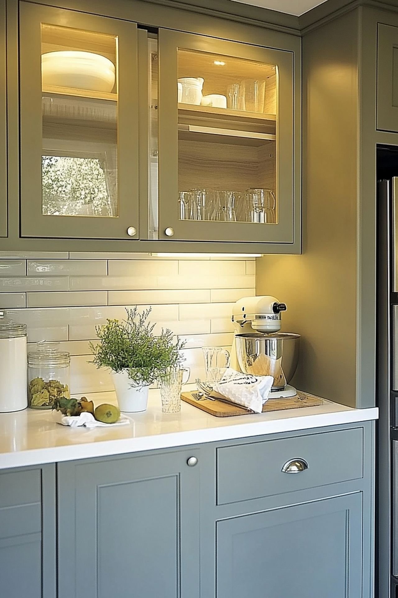 - Incorporate natural light by removing or replacing cabinet doors with glass