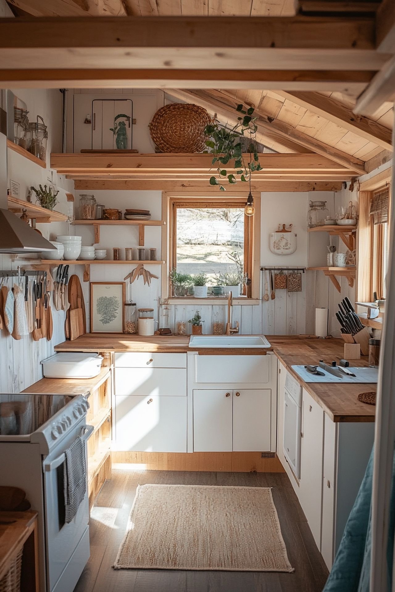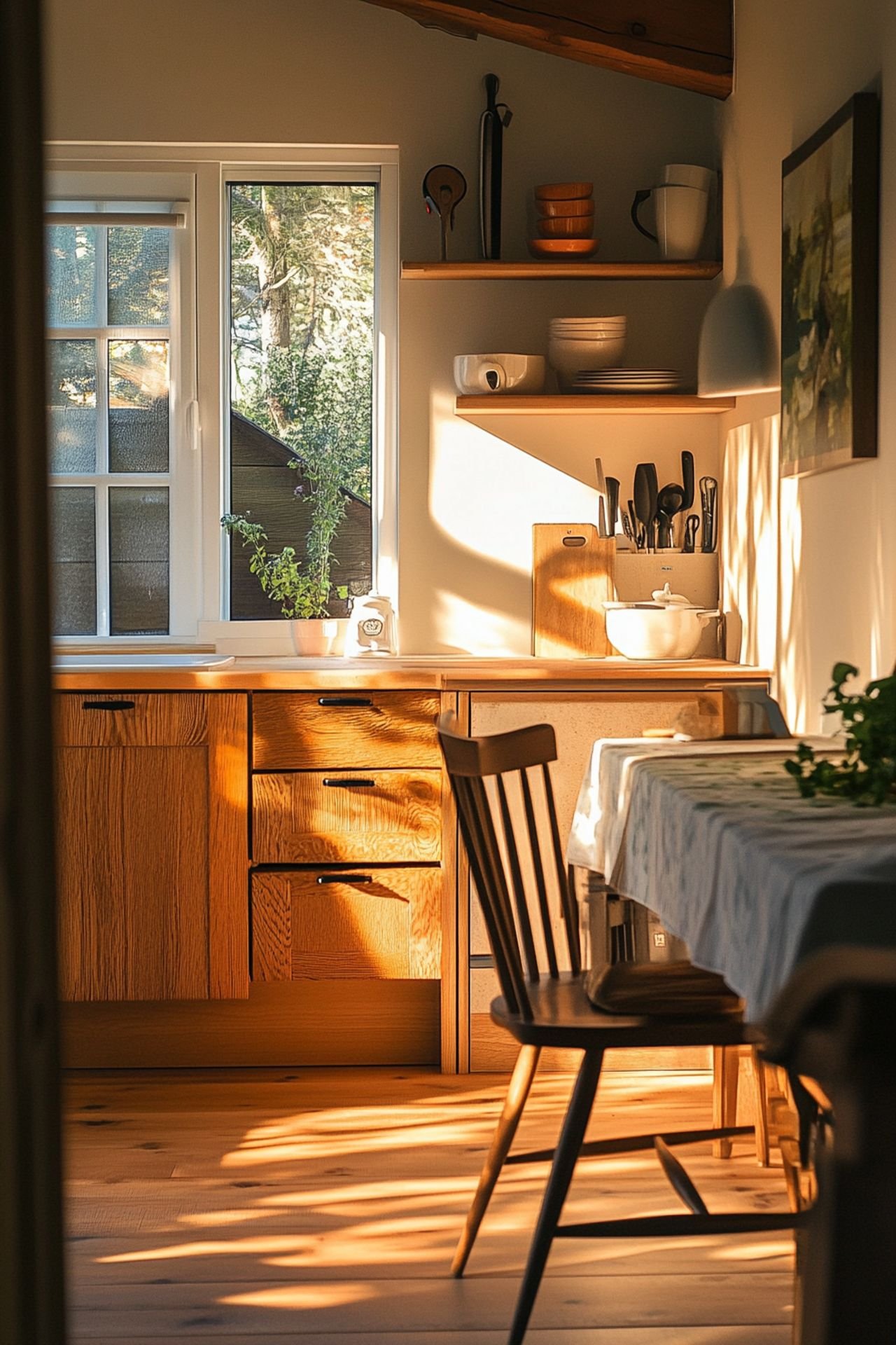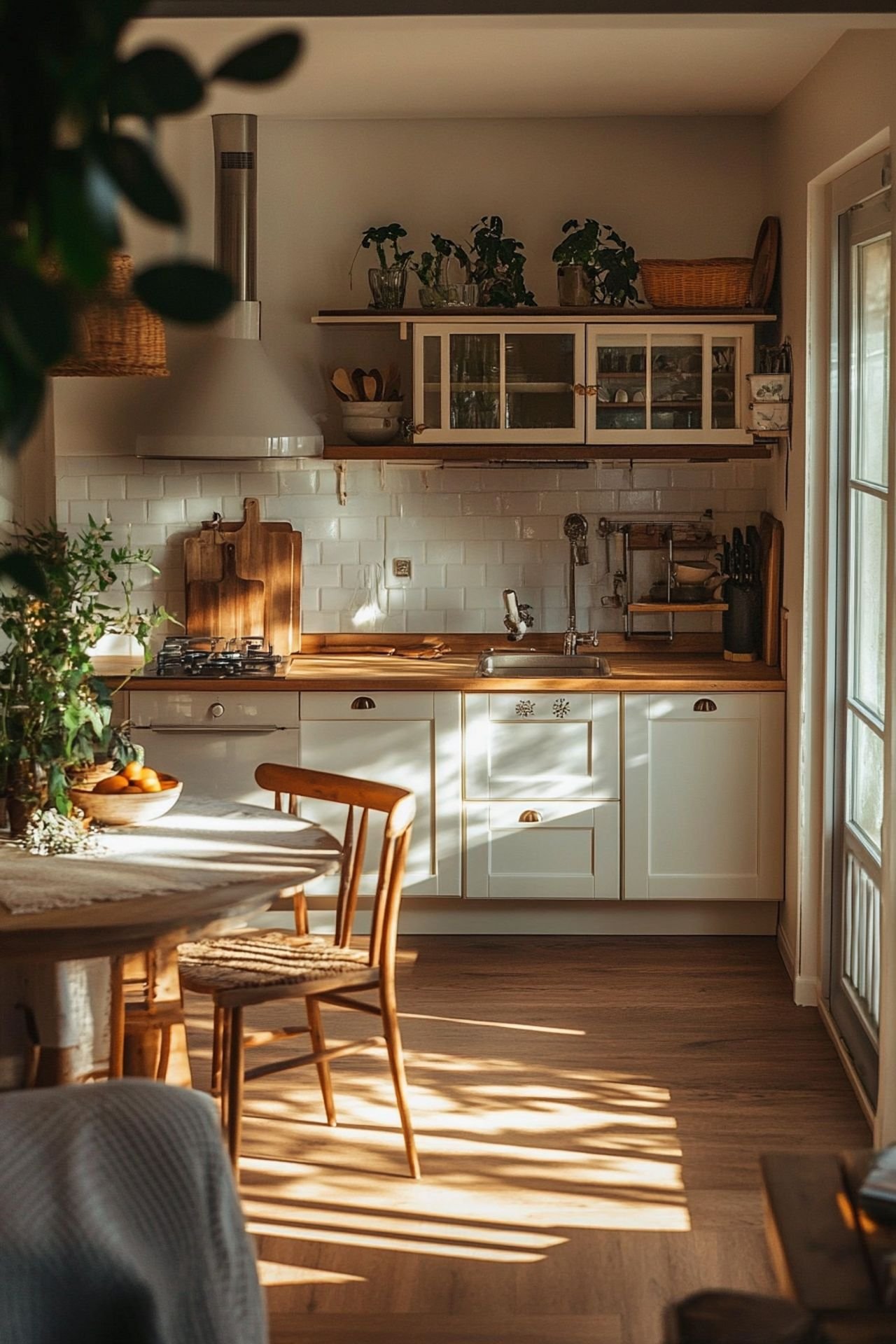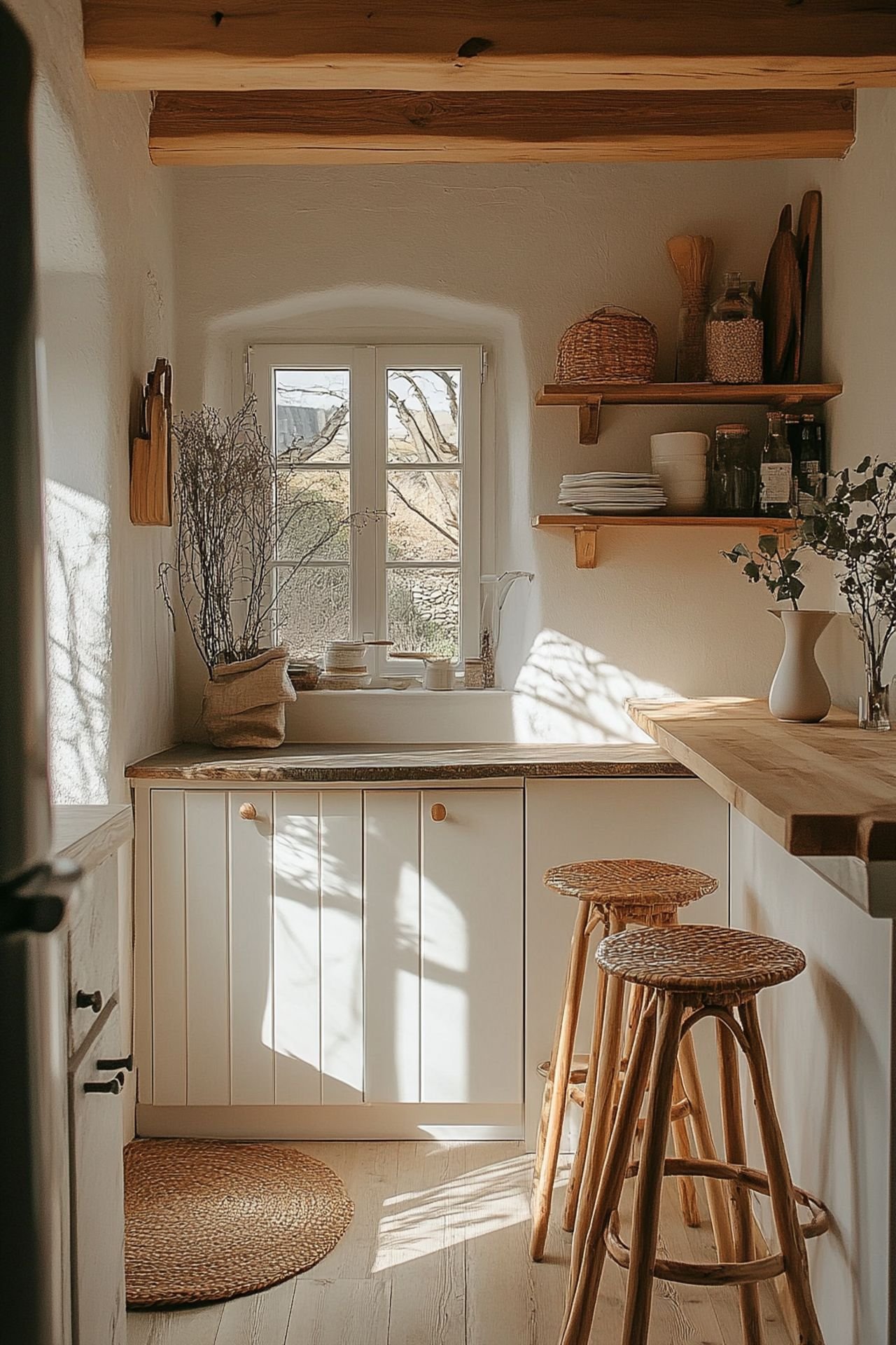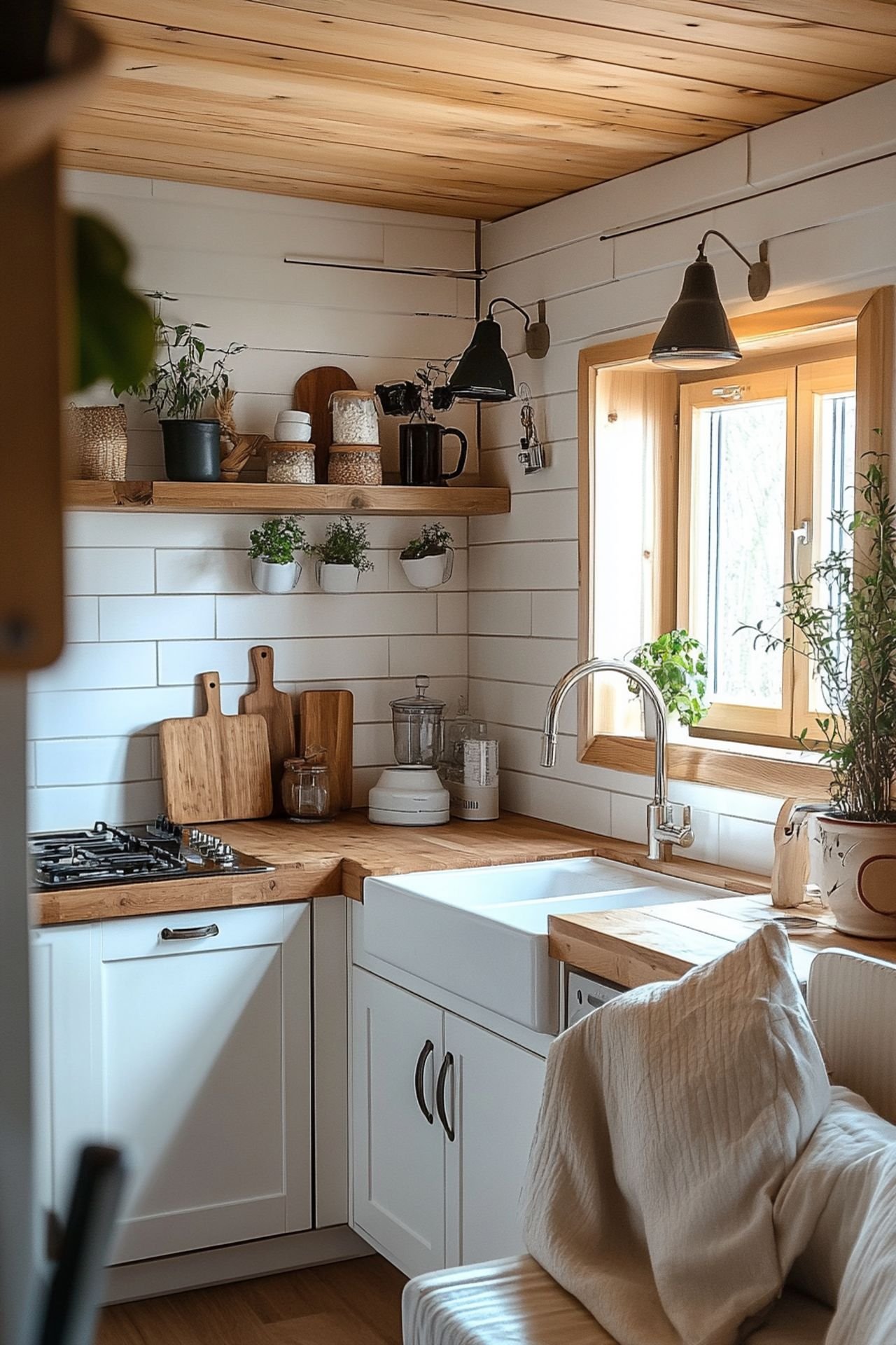 A cottage-inspired kitchenette uses natural materials and soft colors. It also has functional design. This creates a warm and inviting feel.
