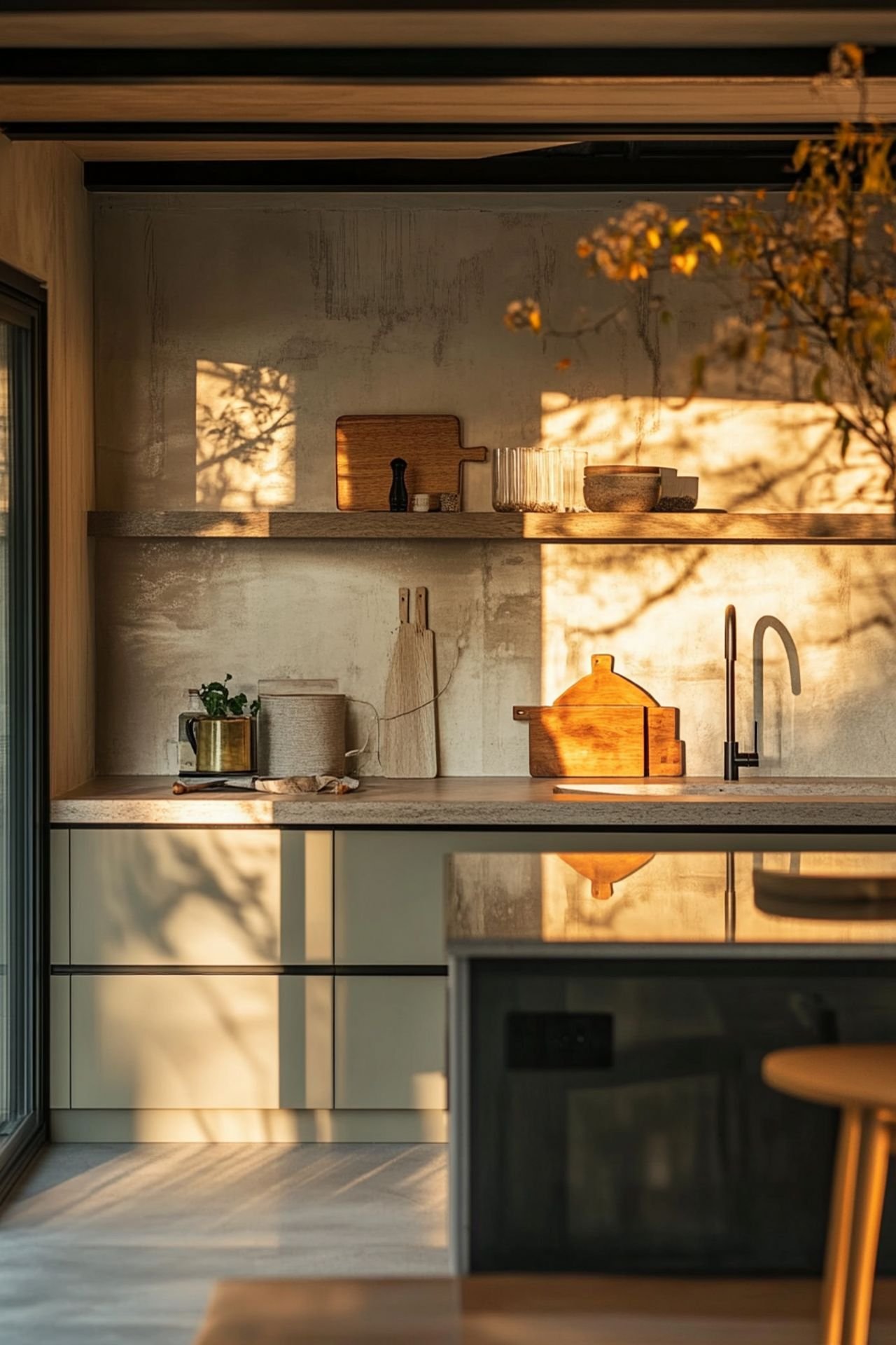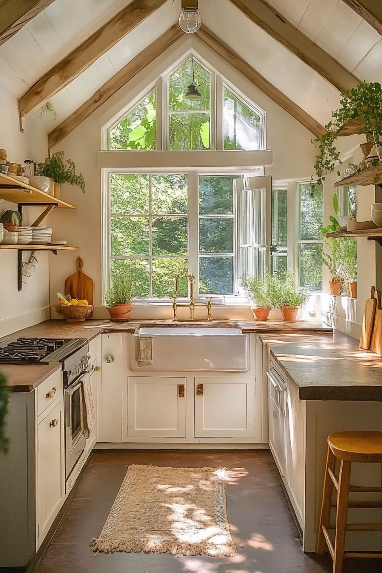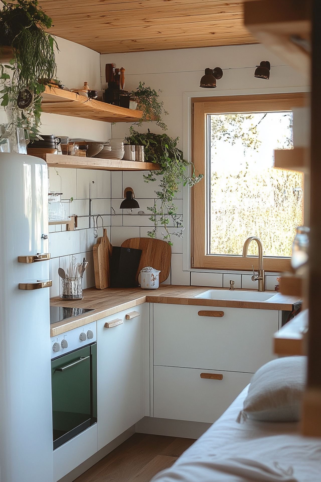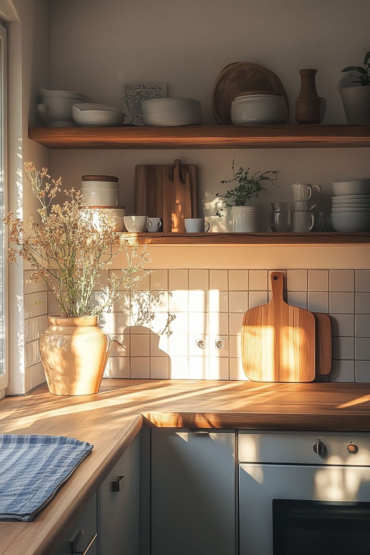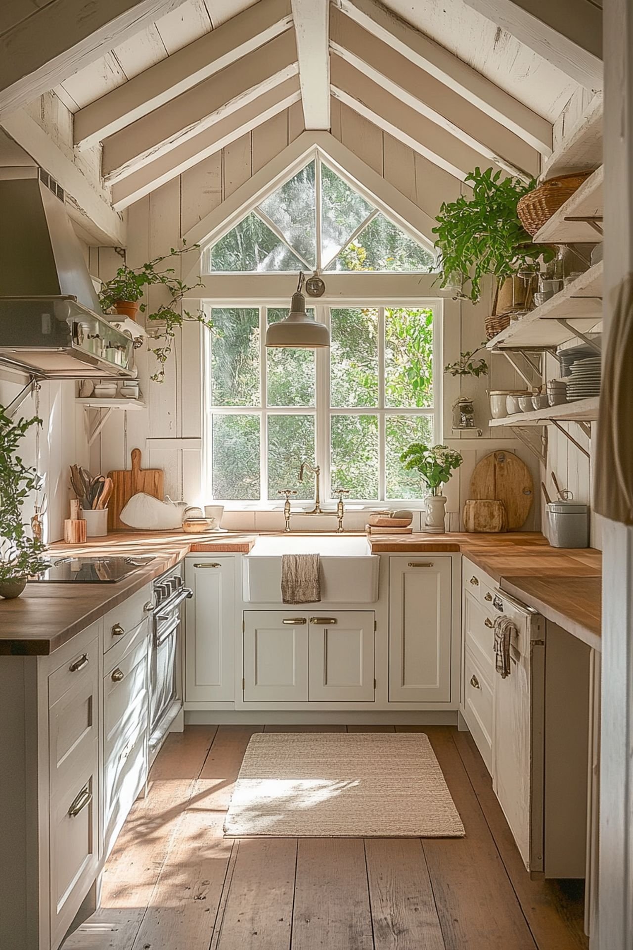A cottage-inspired kitchenette uses natural materials and soft colors. It also has functional design. This creates a warm and inviting feel.