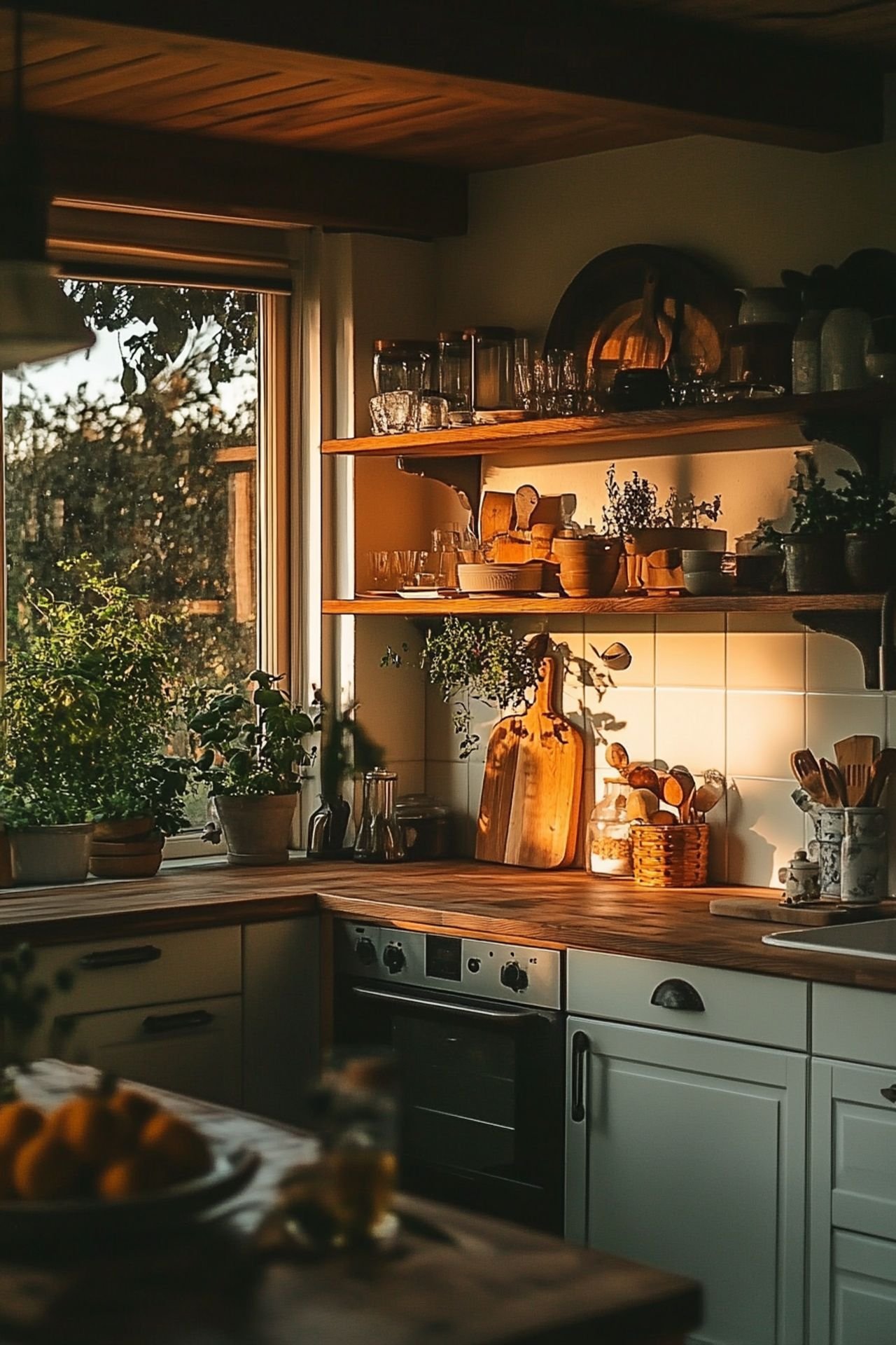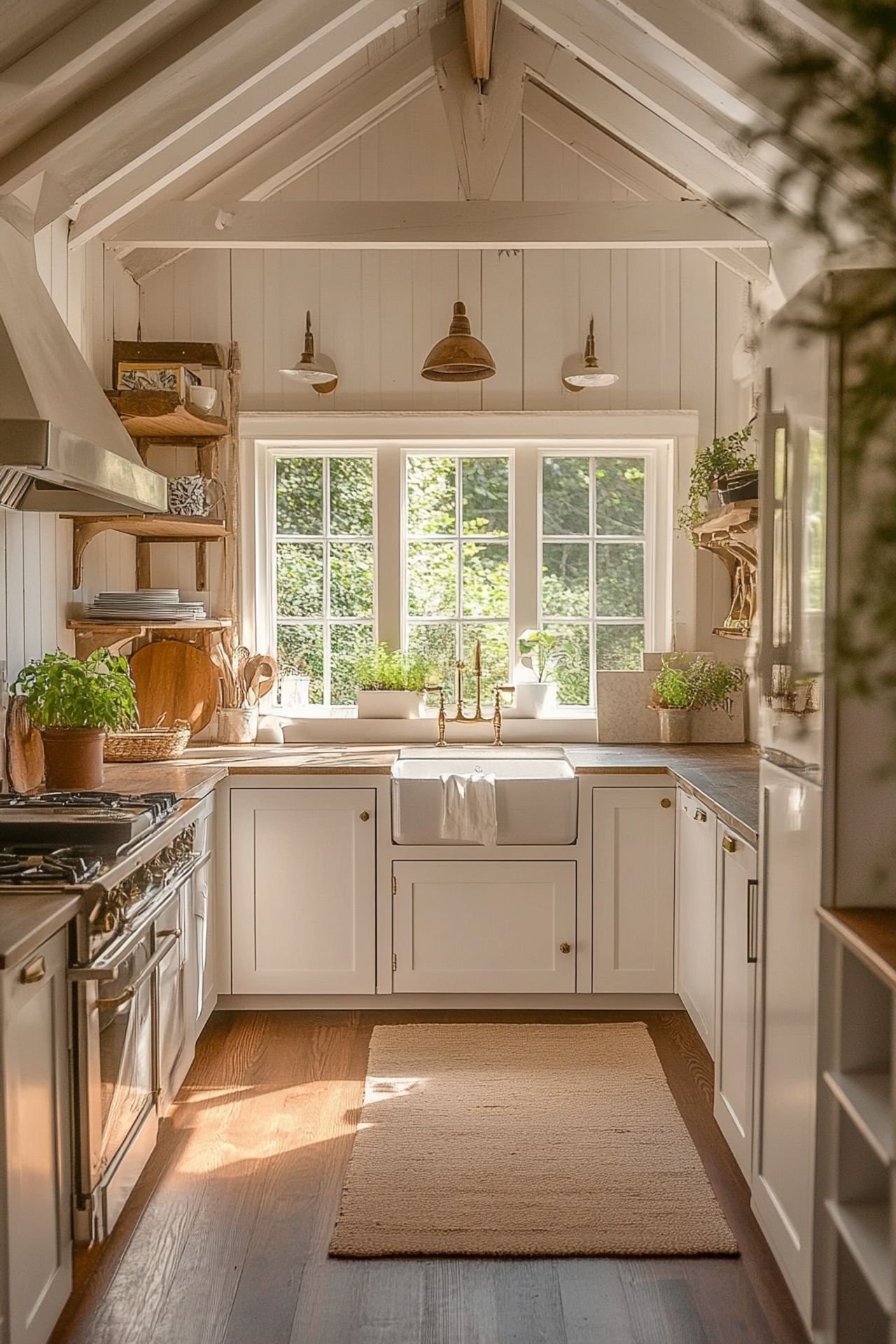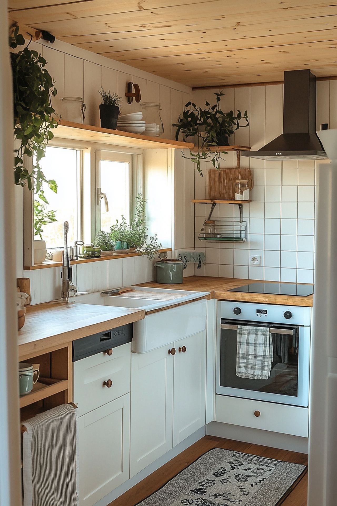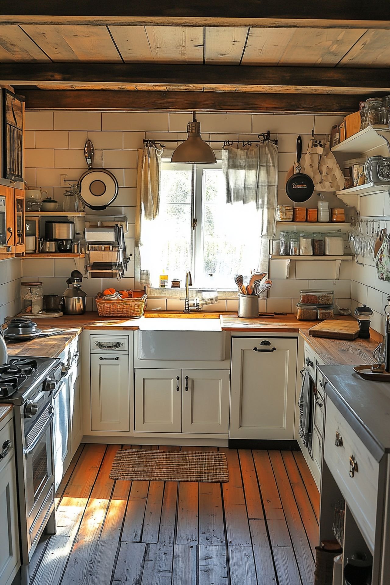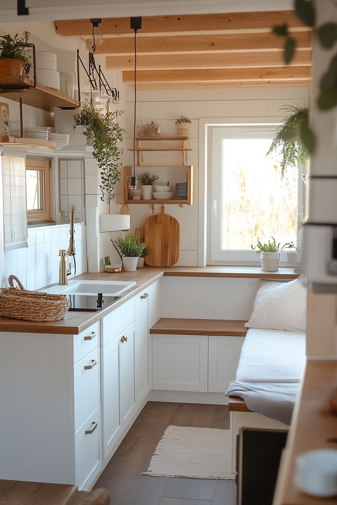 A cottage-inspired kitchenette uses natural materials and soft colors. It also has functional design. This creates a warm and inviting feel.