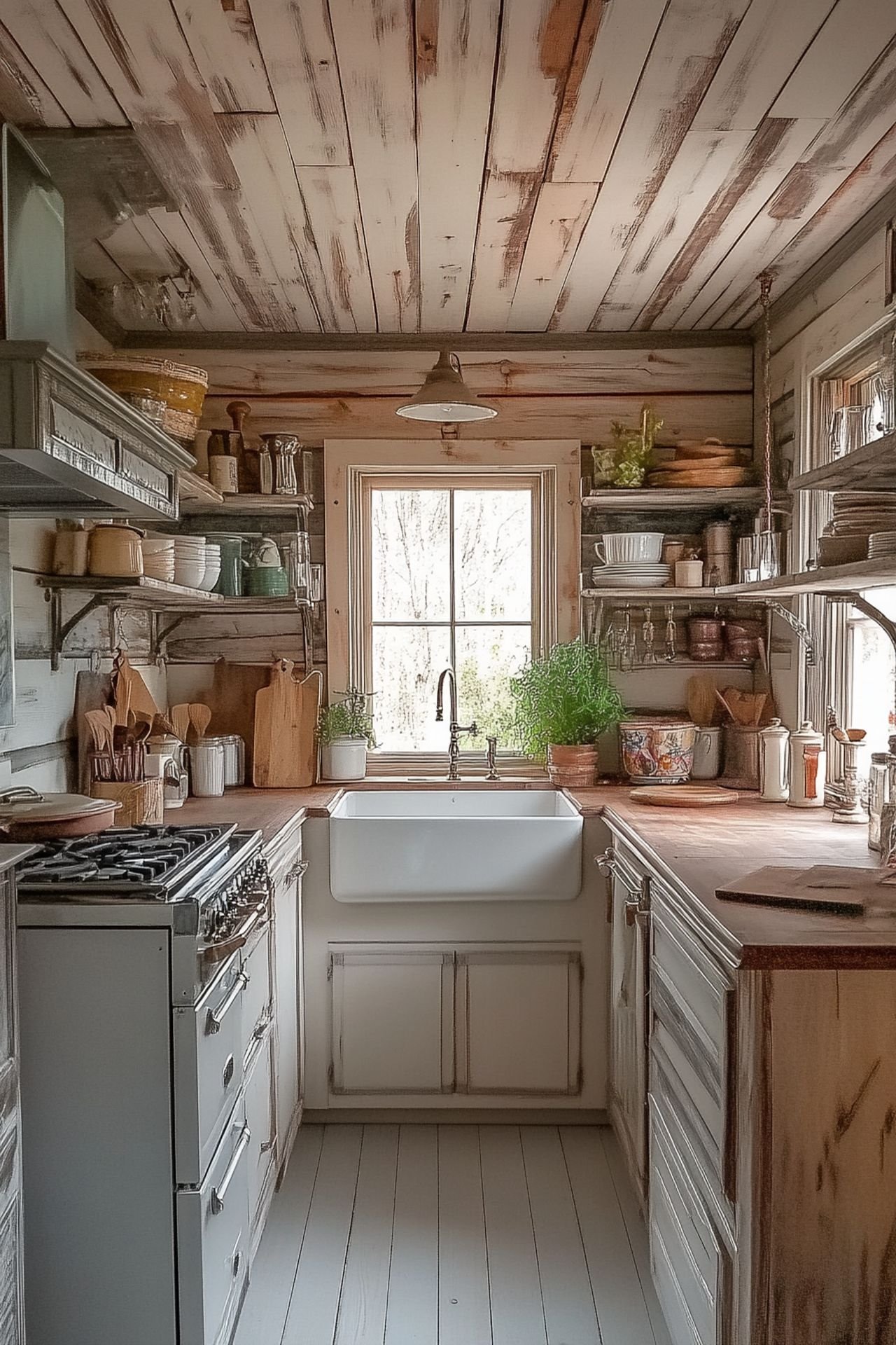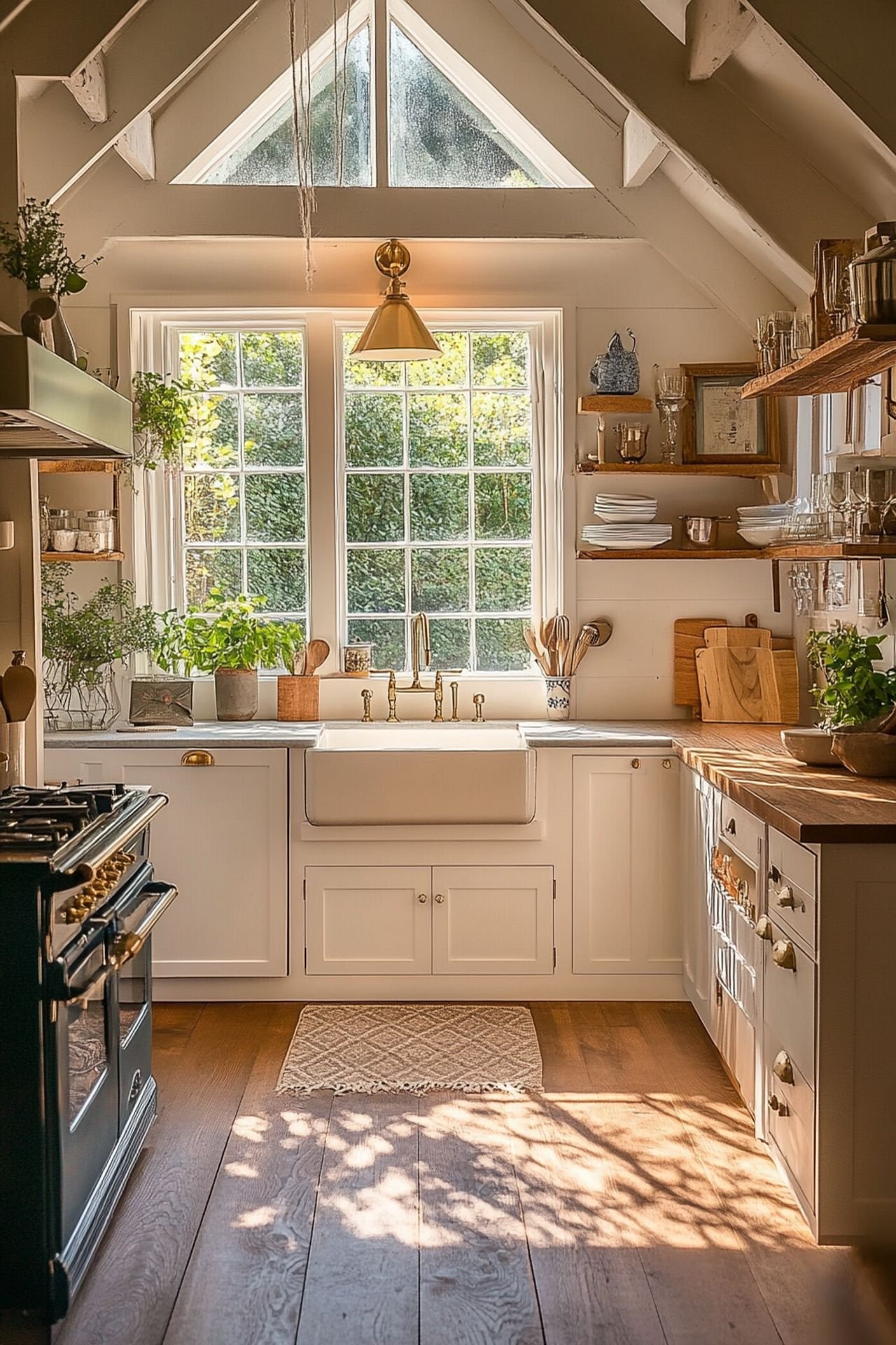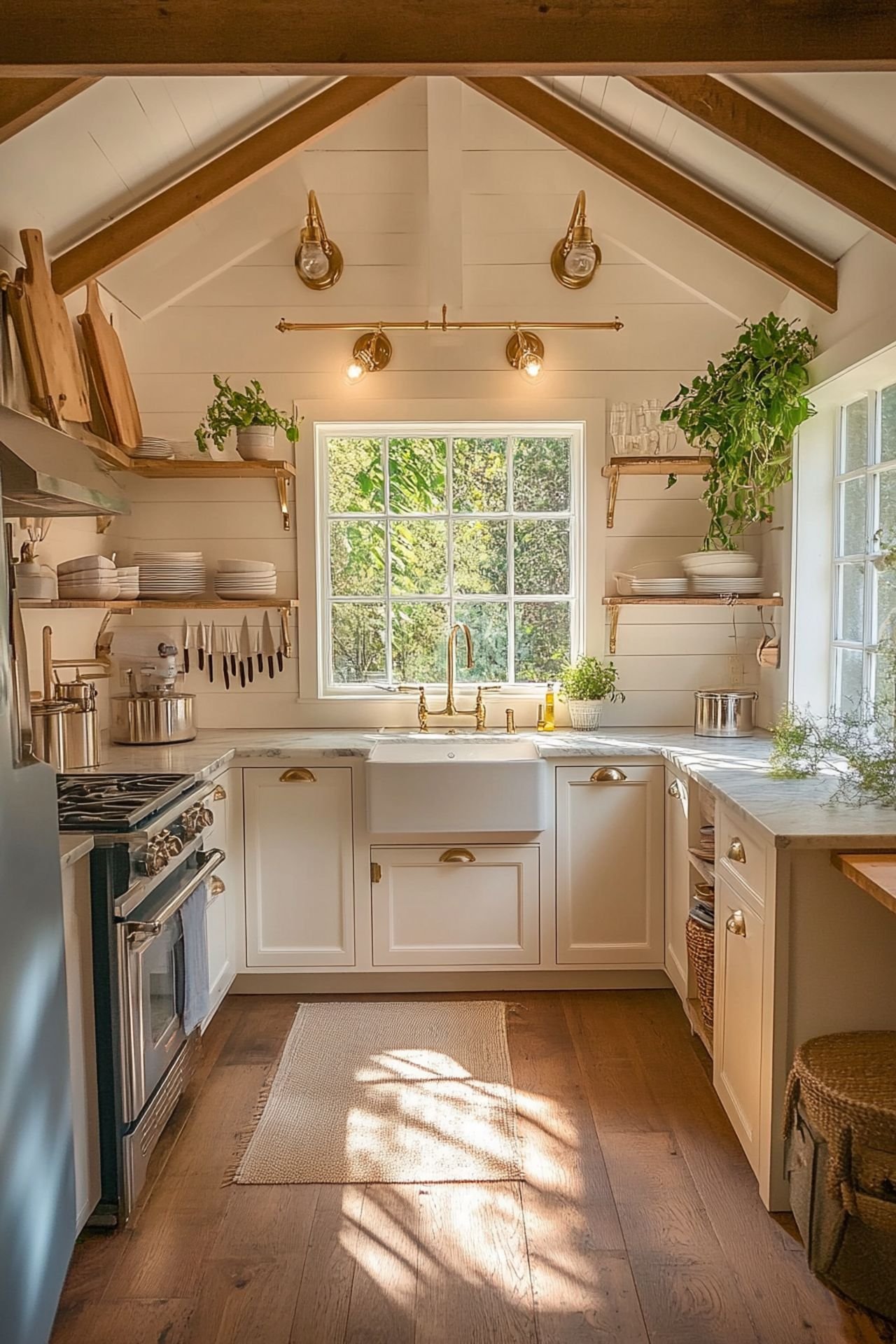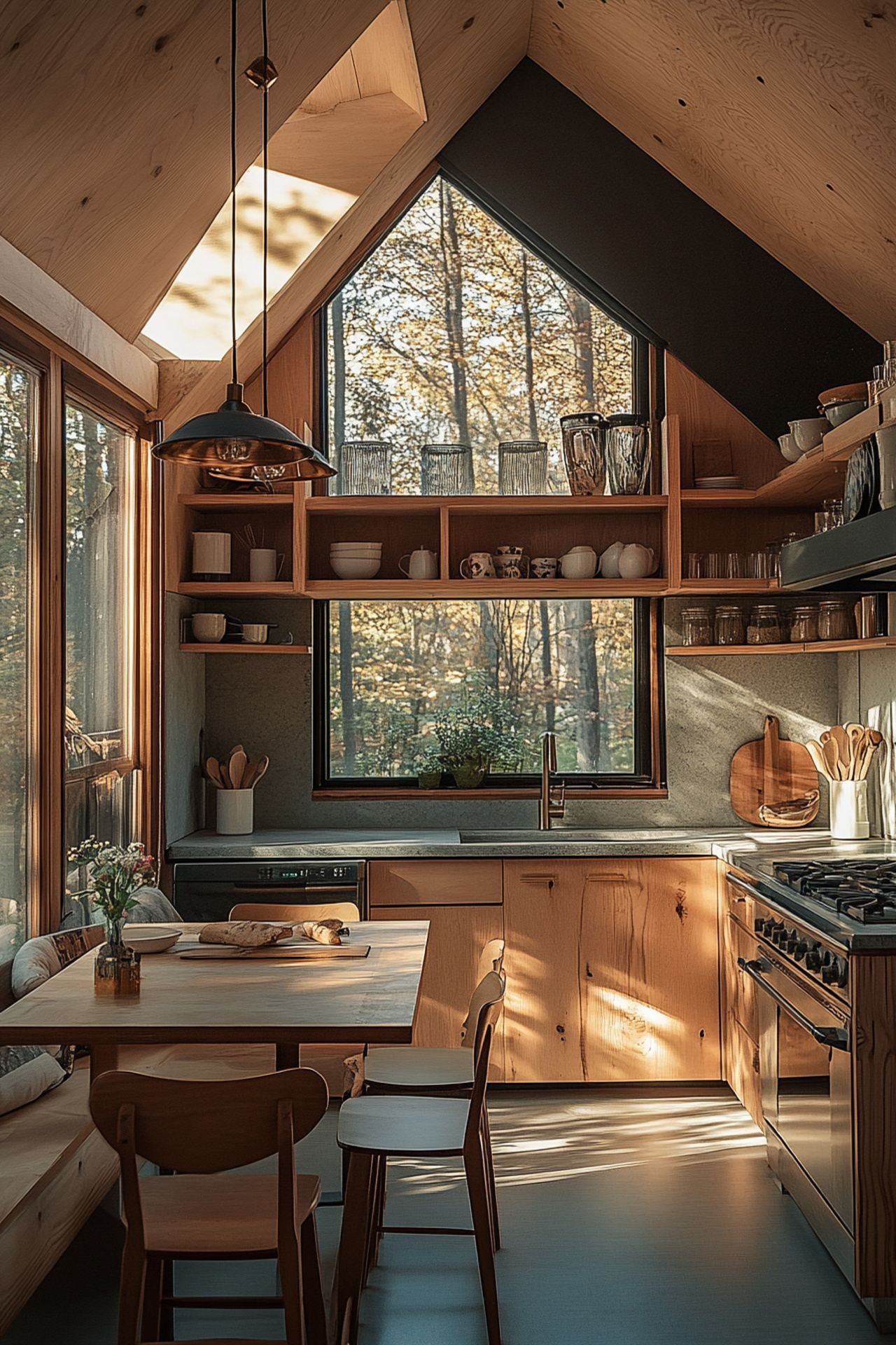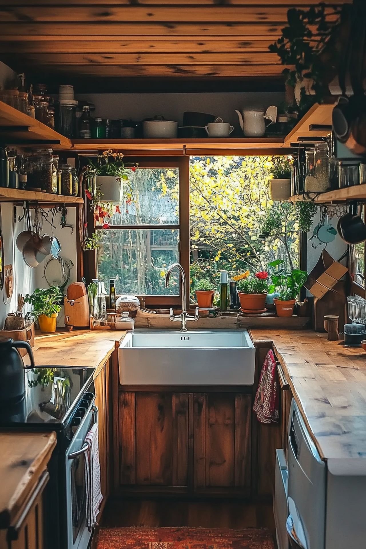 A cottage-inspired kitchenette uses natural materials and soft colors. It also has functional design. This creates a warm and inviting feel.