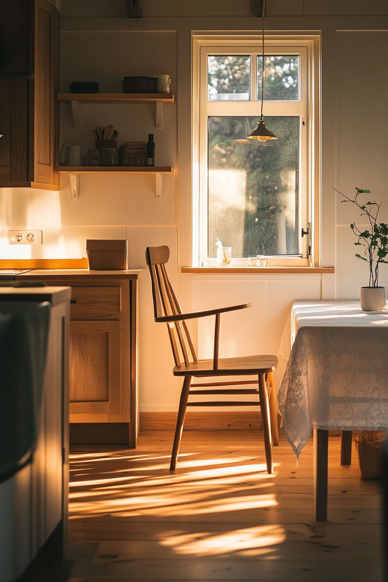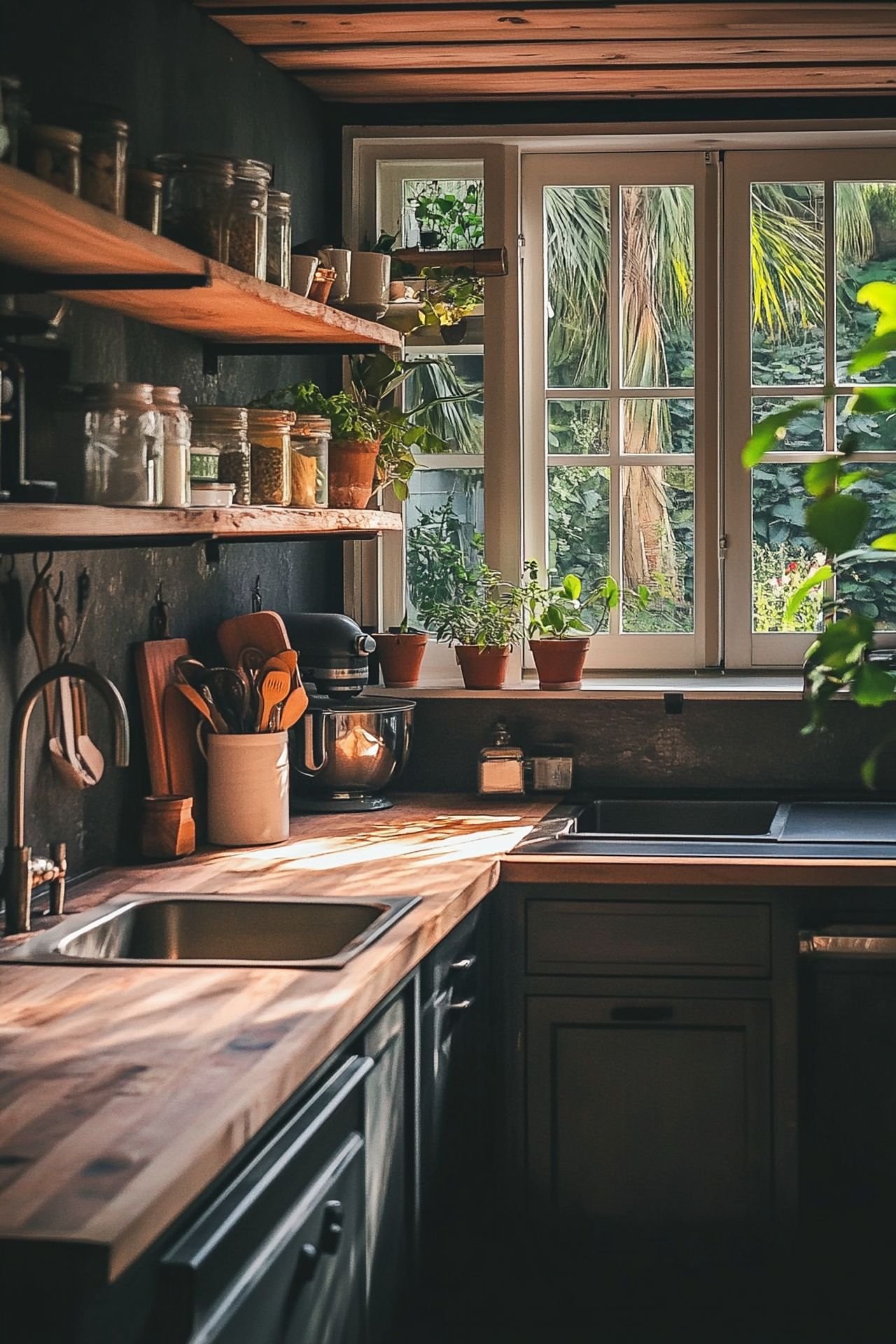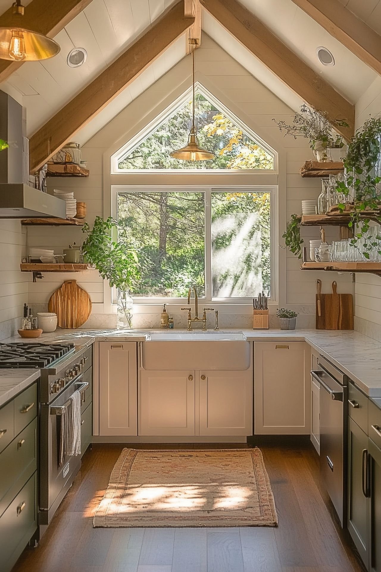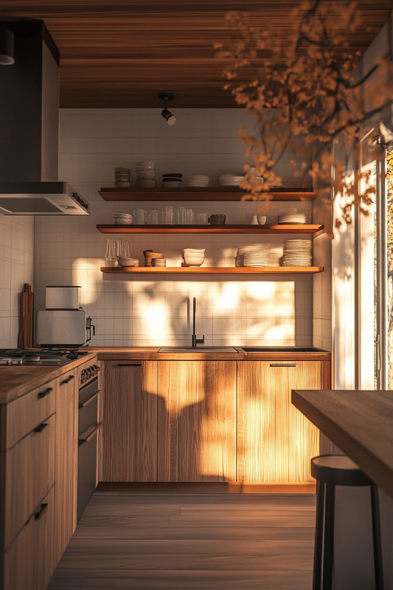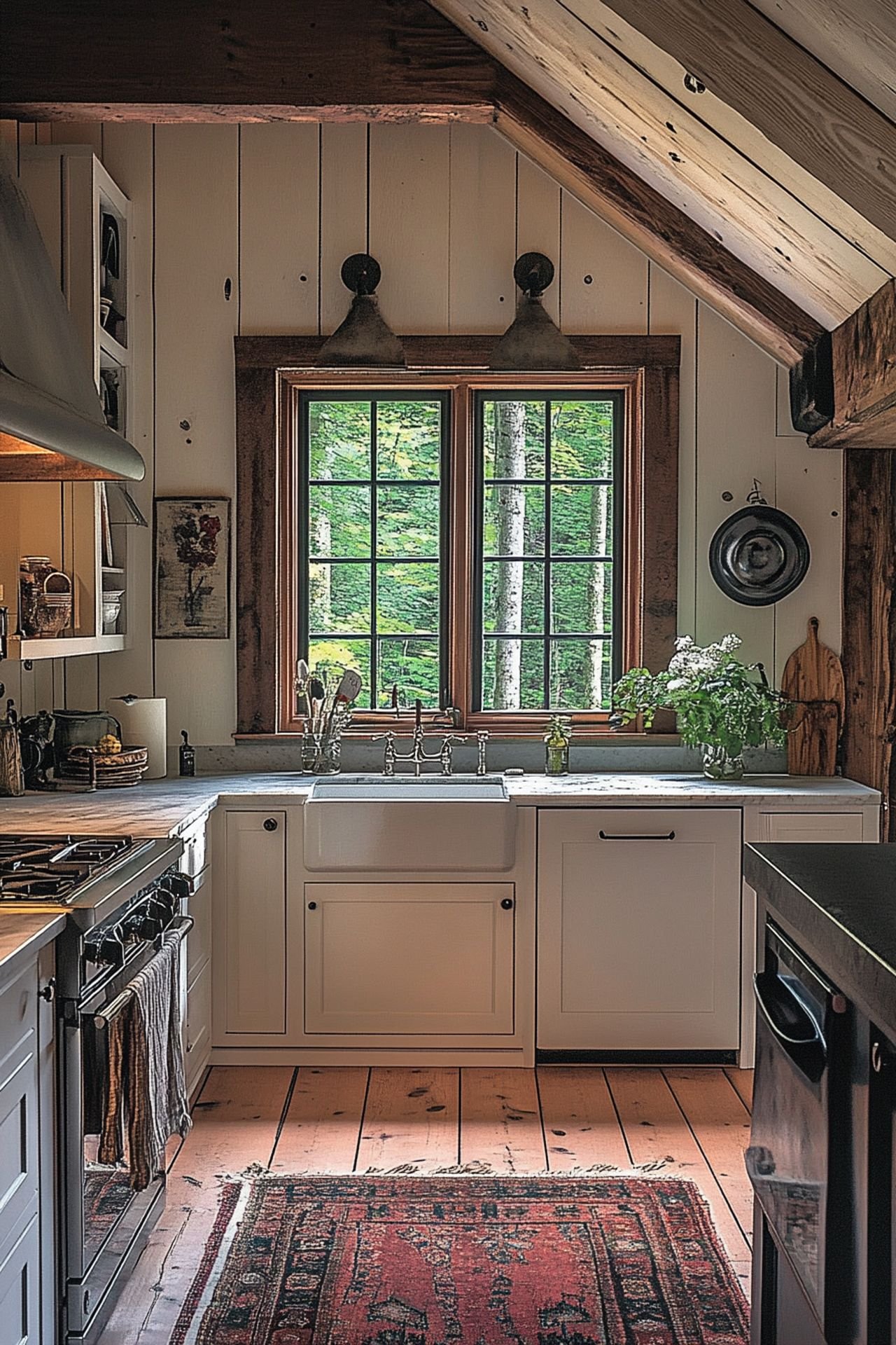 A cottage-inspired kitchenette uses natural materials and soft colors. It also has functional design. This creates a warm and inviting feel.