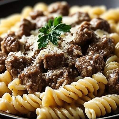 A hearty pasta dish featuring tender beef and rotini coated in a creamy garlic Parmesan sauce.