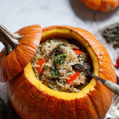 This cozy dinner recipe is a fun, festive, and comforting fall meal that uses an actual pumpkin as a serving vessel. With ground beef, rice, and veggies all baked together inside a tender pumpkin, this is the kind of recipe that brings people together and makes memories around the table.