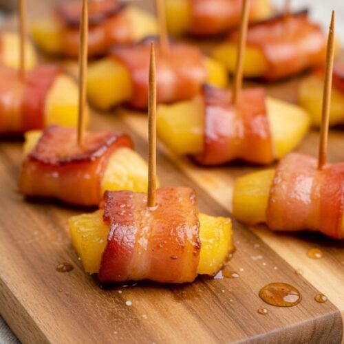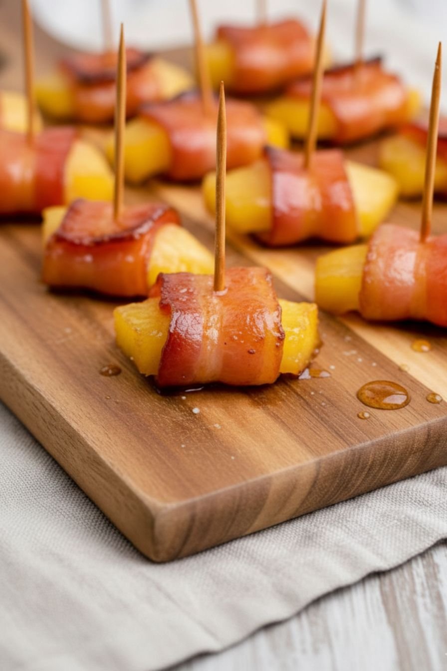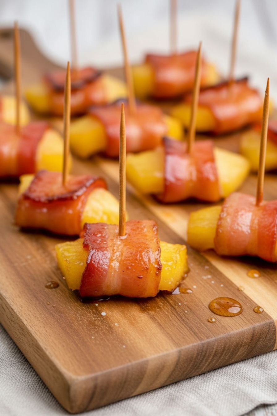 One of the biggest secrets to stress-free entertaining is planning ahead, and this recipe is perfect for that. You can easily get a head start on these delicious bites. To prepare these easy appetizers for a crowd in advance, simply follow the recipe through step 3, where you wrap the pineapple chunks in bacon and secure them with a toothpick. Place the assembled, uncooked skewers on a baking sheet lined with parchment paper and cover them loosely with plastic wrap. They can be refrigerated for up to 24 hours before you’re ready to cook.
