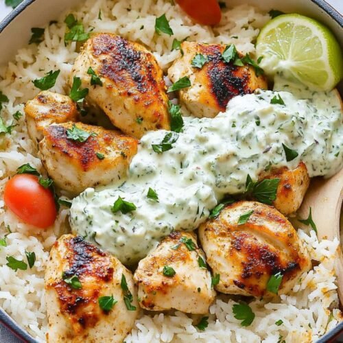 - Spread the tzatziki mixture evenly over the chicken and rice.