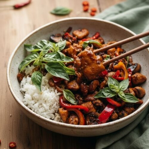 This dish combines the richness of sautéed chicken with a sweet-savory glaze of honey and soy sauce, balanced by fresh basil and crunchy cashews. It’s perfect for weeknights when you want something fast, flavorful, and satisfying.
