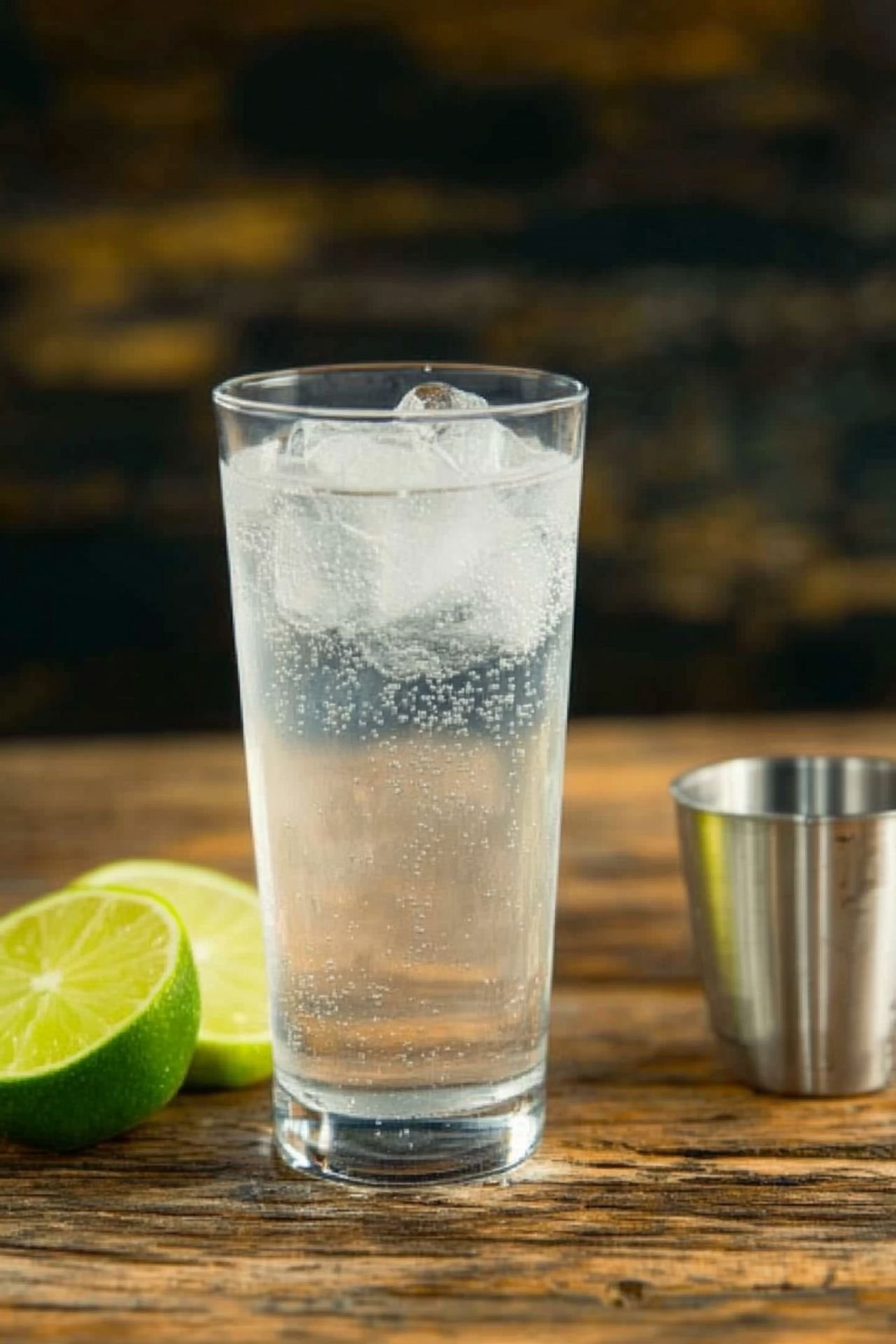 - Fill a highball or tall glass with ice cubes.