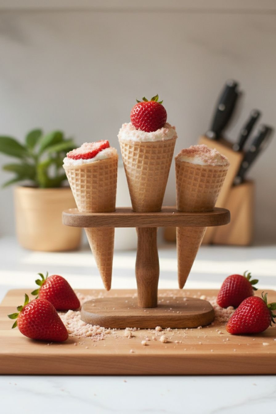- Assemble the Cones: Gently stuff the bottom of each cone with a few sliced strawberries. Spoon or pipe the cheesecake filling into the cones, filling them almost to the top. Press a few more strawberry slices into the top of the filling.
