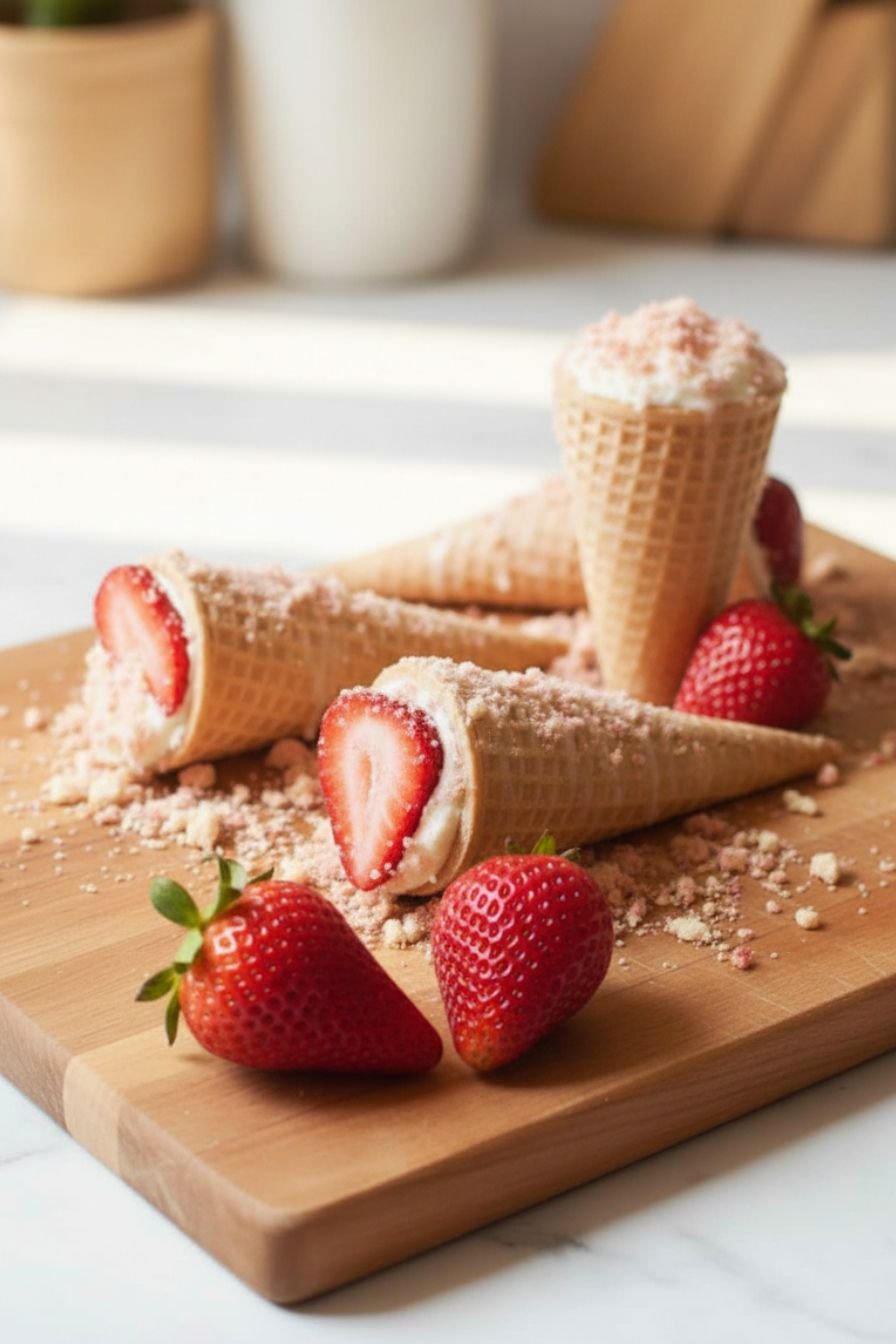 Every so often, a recipe comes along that is so much more than the sum of its parts. That’s this one. It’s not just a dessert; it’s an experience. We’re talking about a crispy, ready-to-eat cone, cradling a luscious, creamy cheesecake filling, studded with sweet, juicy strawberries. Then, it’s all crowned with a dreamy glaze and a shower of the most incredible strawberry crunch. This isn’t just one of those quick dessert ideas you throw together at the last minute; it’s a conversation starter. The combination of textures—the crunch, the creaminess, the fresh pop of fruit—is pure magic. Whether you’re planning a birthday party, a baby shower, or just a special treat for your family, this easy dessert is guaranteed to steal the show. It’s playful, elegant, and proof that you don’t need an oven to create something truly spectacular.