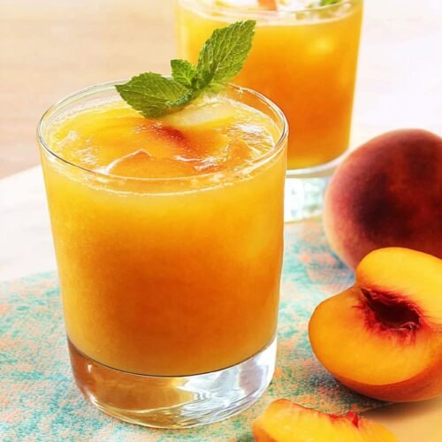 - Garnish with a slice of peach and a sprig of mint. Serve immediately.