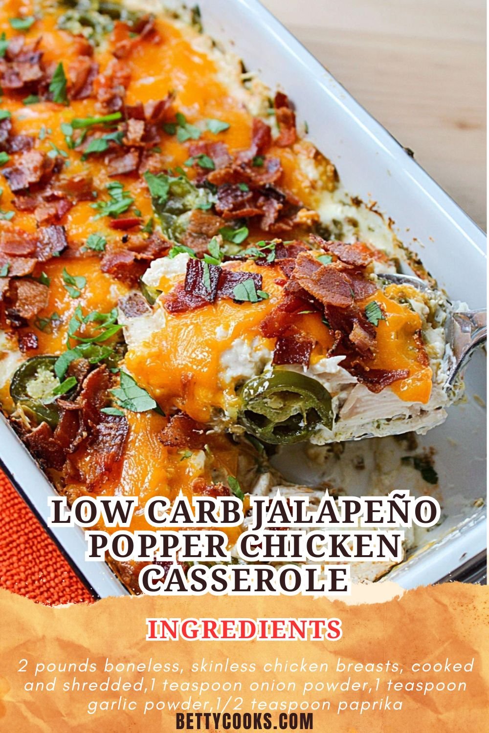 Jalapeños bring a gentle heat that balances beautifully with the richness of the cheese. Remove the seeds for a milder bite, or leave them in if you like it spicy. They give this dish just the right edge, turning it from a basic chicken bake into one of our favorite comfort food recipes on Betty Cooks.