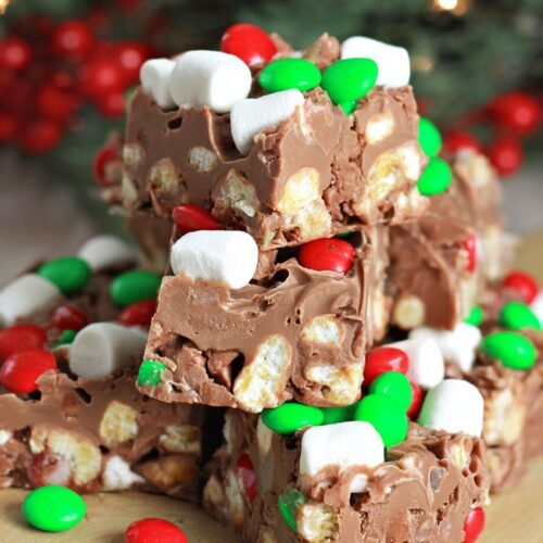 Keywords: Christmas treats, easy holiday recipes, festive desserts, holiday no bake, marshmallow bars, no bake desserts, quick dessert ideas