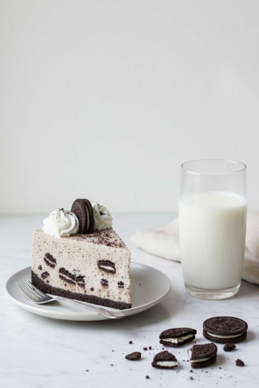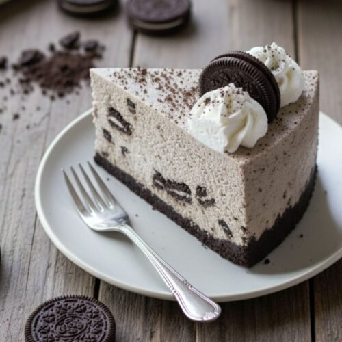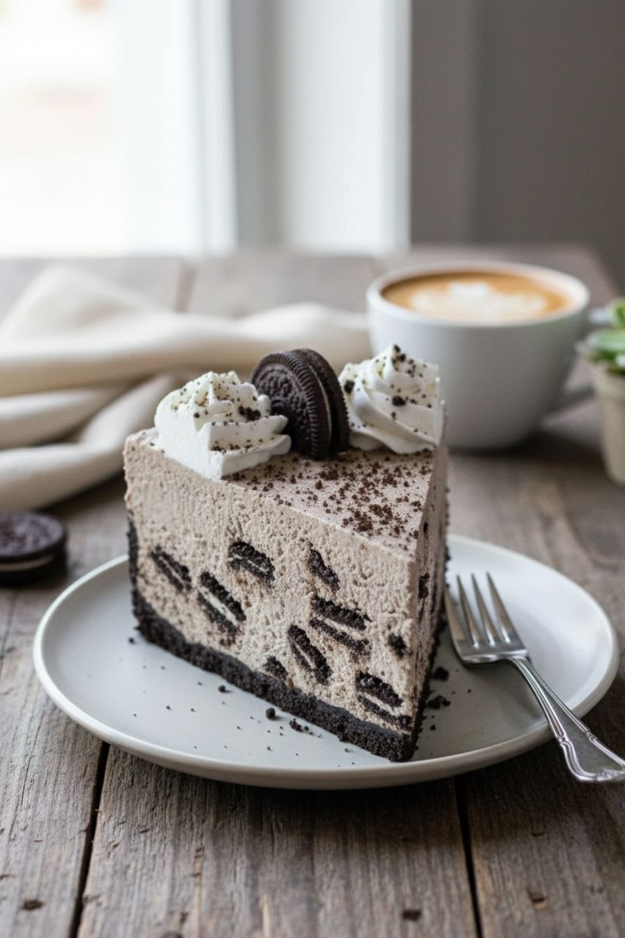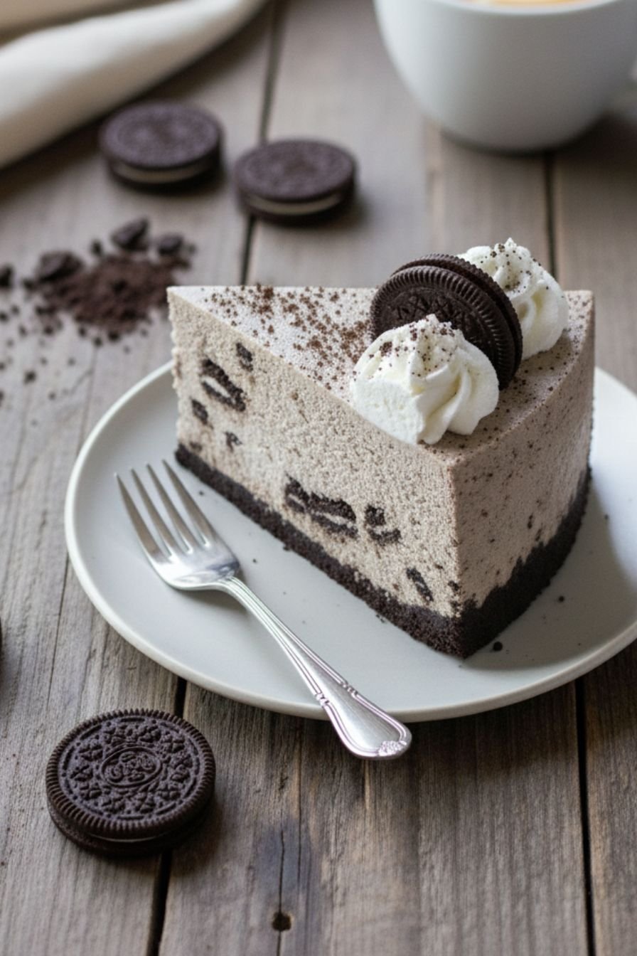 If your heart belongs to chocolate cookies, this recipe celebrates that passion in every layer. Oreos appear three different ways throughout the cheesecake: crushed finely for the structural crust, mixed into the filling for texture and flavor, and chopped into larger chunks for delightful surprises with each bite. The final presentation includes whole Oreos cut in half arranged artfully around the whipped cream border, making this a visual masterpiece before anyone even tastes it. The depth of chocolate flavor from all these different applications creates a complexity that belies the simplicity of preparation. This Oreo-forward approach means that every component of the dessert celebrates the cookie itself rather than burying it under competing flavors. The recipe truly delivers on the promise of being an Oreo lover’s ultimate indulgence without any of the work associated with traditional cheesecake baking.