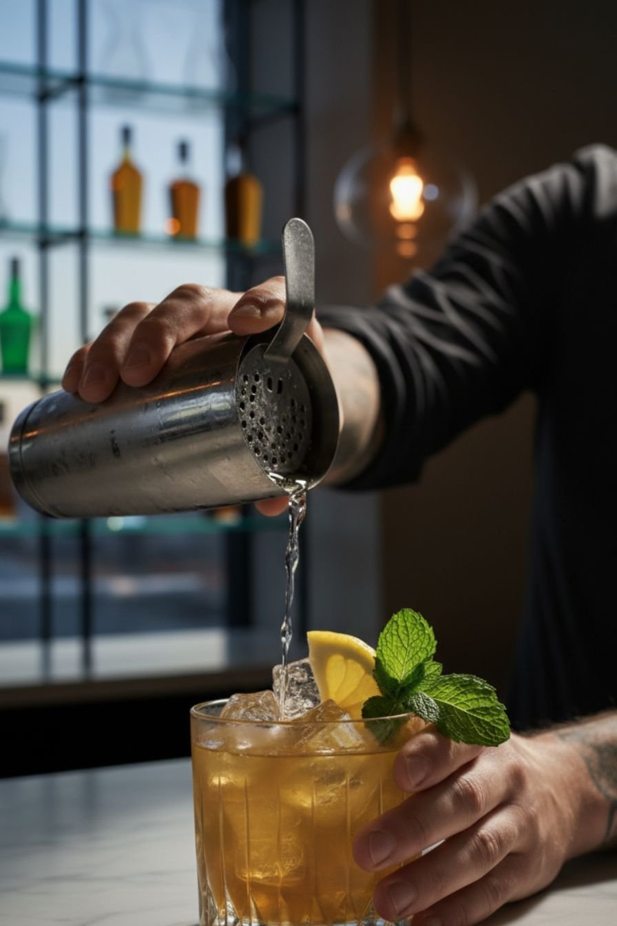 - Double-strain the mixture into an ice-filled rocks glass (or a chilled coupe if preferred without ice).