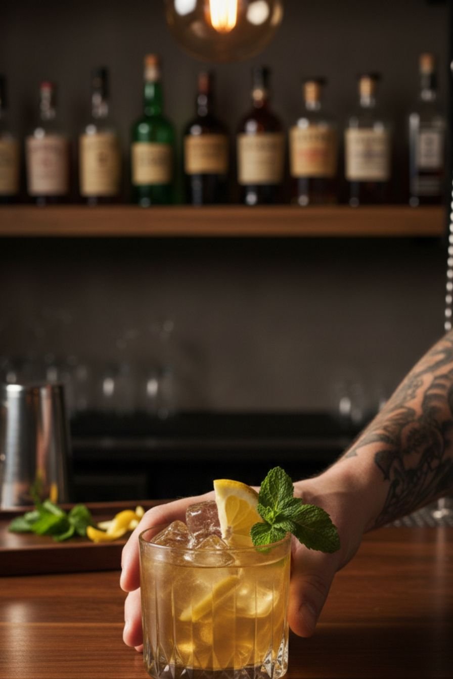 - Garnish with a fresh mint sprig and a lemon wheel.