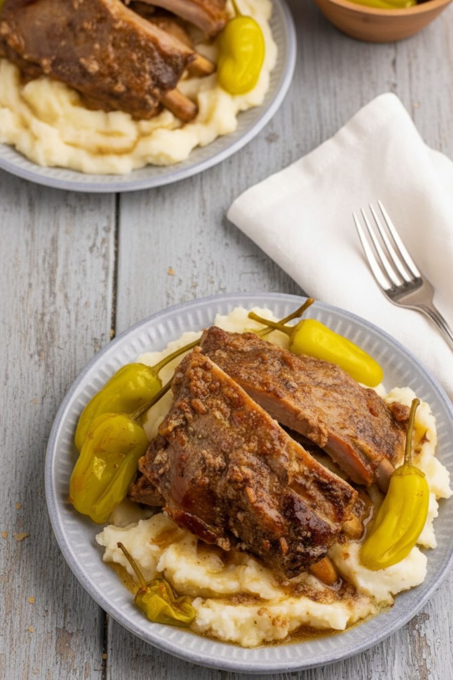 Tender fall-off-the-bone slow cooker mississippi ribs infused with pepperoncini peppers, au jus, and ranch seasonings for an easy and delicious comfort food dinner.