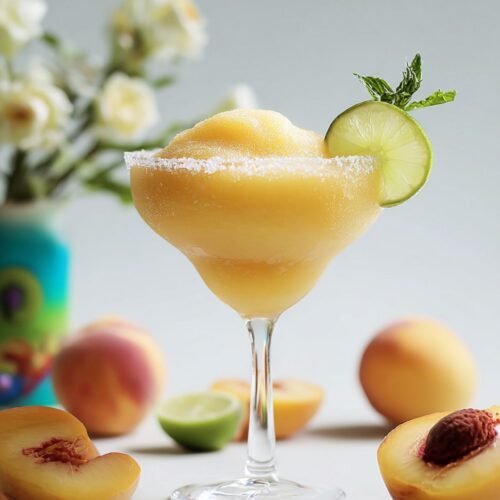 Pour the frozen margarita into glasses and garnish with a lime slice or peach wedge.